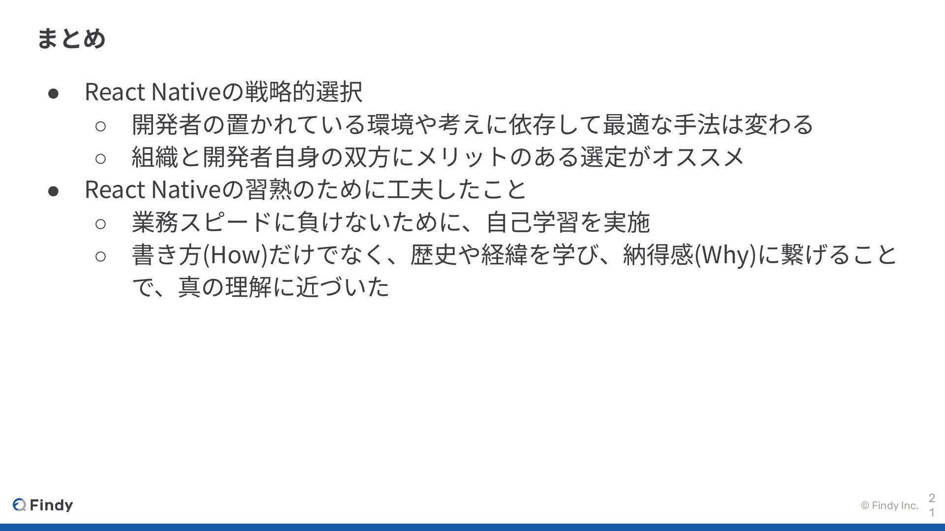 © Findy Inc. 2 1 まとめ • React Nativeの戦略的選択 ◦