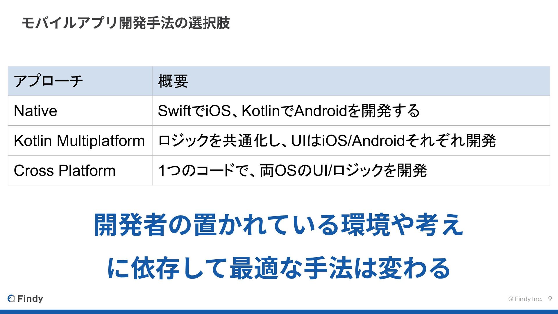 © Findy Inc. 9 モバイルアプリ開発⼿法の選択肢 アプローチ 概要 Native SwiftでiOS、KotlinでAndroidを開発する Kotlin