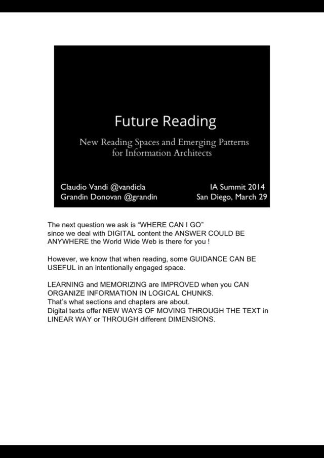 Even if its death as such is not a problem, WE STILL NEED solutions for ESTABLISHING a rhythm and ORGANIZING CONTENT. WHAT is the unit, HOW do you move from UNIT to UNIT, across chapters or through the text ? HOW DO YOU VISUALIZE POSITION when the book thickness is no more an option ? The BOOK HAD SOLUTIONS for most of this questions as it evolved over centuries to fit our way of reading. HOW TO communicate the DIMENSIONS of a FLAT OBJECT ?