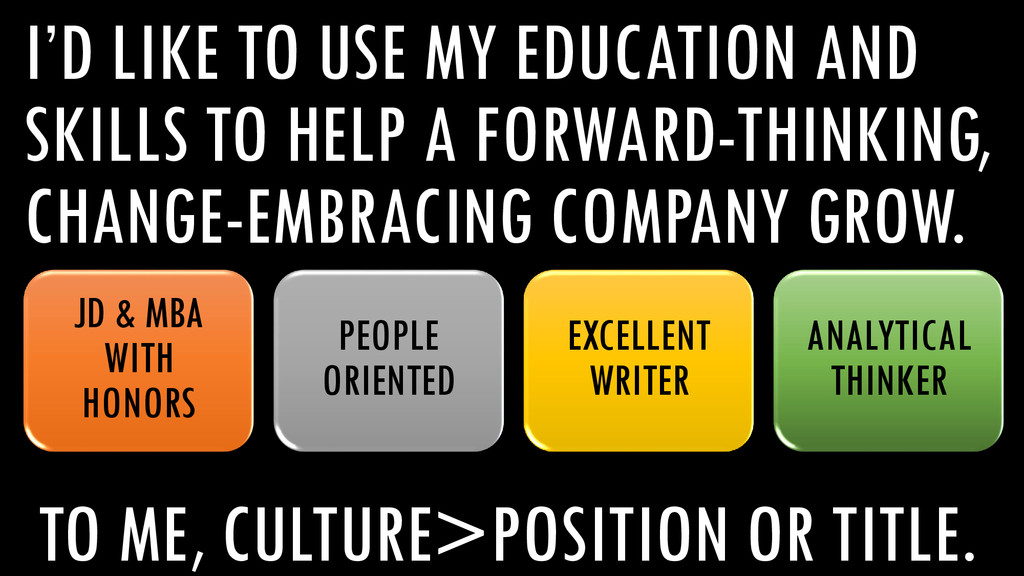 A FORWARD-THINKING, CHANGE-EMBRACING COMPANY GROW. TO ME, CULTURE>POSITION OR TITLE. JD & MBA WITH HONORS PEOPLE ORIENTED EXCELLENT WRITER ANALYTICAL THINKER