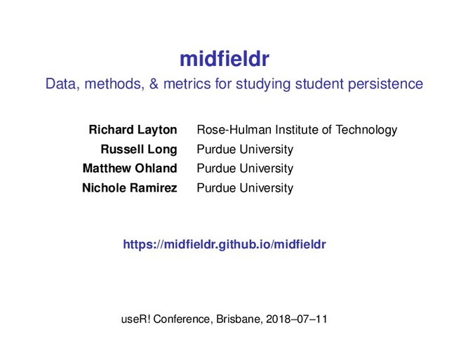 This talk introduces R users to data and tools for investigating undergraduate persistence metrics using the midfieldr and midfielddata packages. The data are the student records (registrar's data) of approximately 98,000 undergraduates at US institutions from 1987 to 2016. The goal of the talk is to introduce the packages and to share our data, methods, and metrics for intersectional research in student persistence.