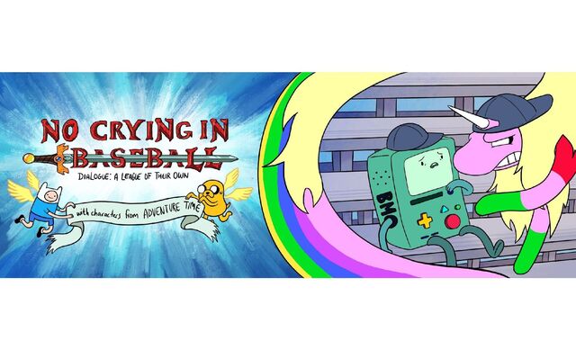 BMO is crying and Lady Rainicorn has something to say about it. Characters from Adventure Time and Dialogue from League of Their Own.