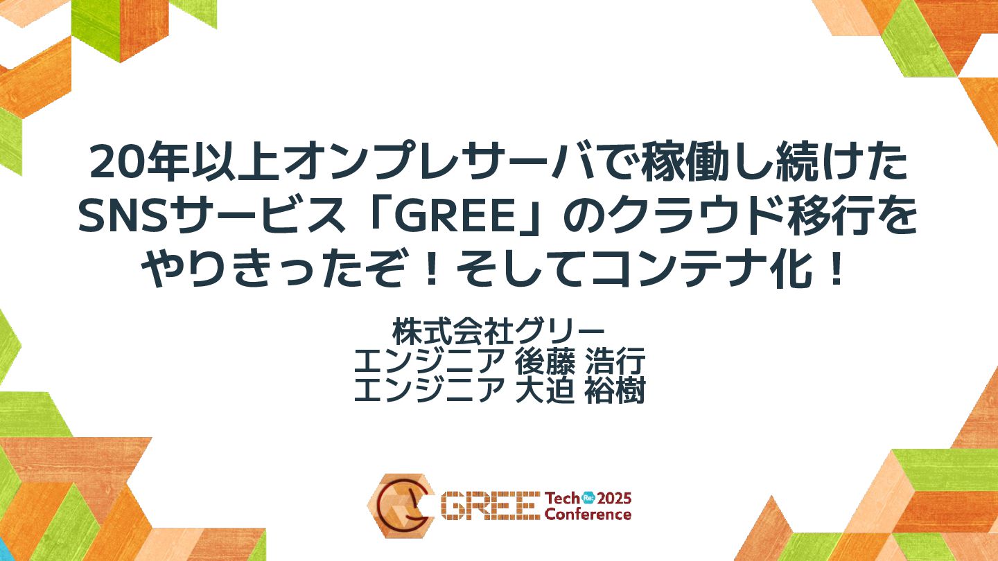 20年以上オンプレサーバで稼働し続けた SNSサービス「GREE」のクラウド移行を やりきったぞ!そしてコンテナ化! 株式会社グリー エンジニア 後藤 浩行 エンジニア 大迫 裕樹