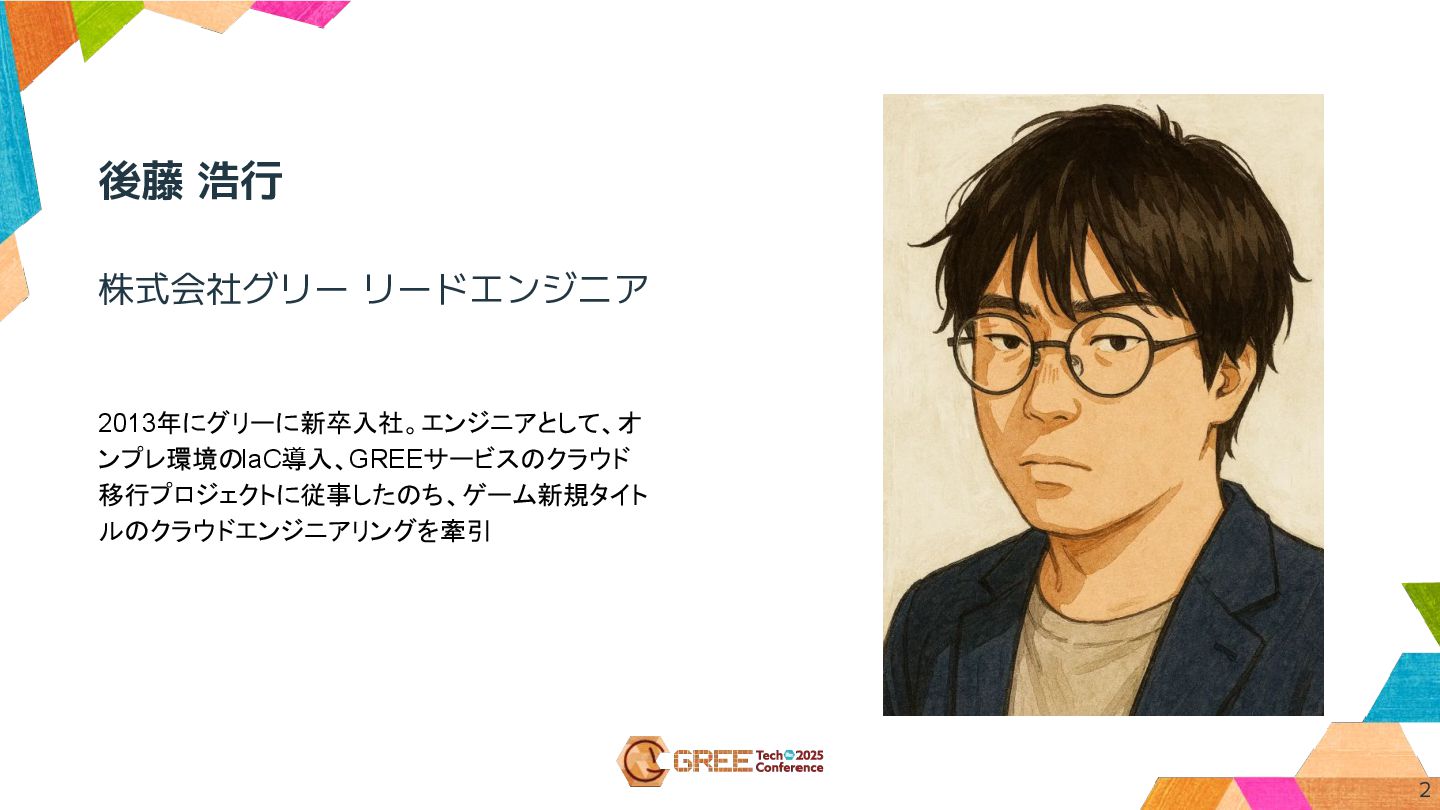 後藤 浩行 2013年にグリーに新卒入社。エンジニアとして、オ ンプレ環境のIaC導入、GREEサービスのクラウド 移行プロジェクトに従事したのち、ゲーム新規タイト ルのクラウドエンジニアリングを牽引 株式会社グリー リードエンジニア 2
