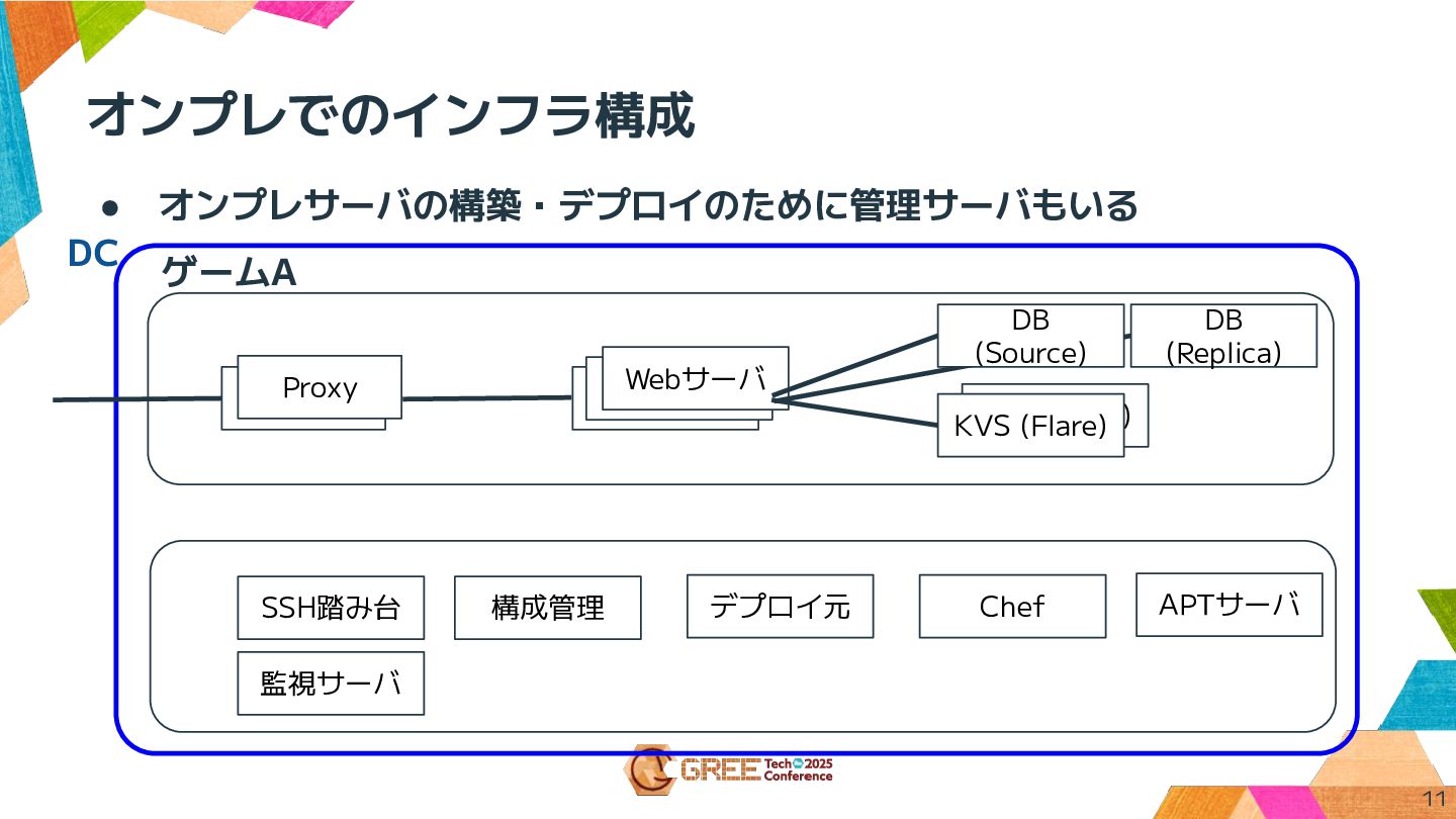 オンプレでのインフラ構成 10 • 各サービスは基本的に以下のような構成 (インフラ的にはフラット) ゲームA Proxy Webサーバ DB (Primary)