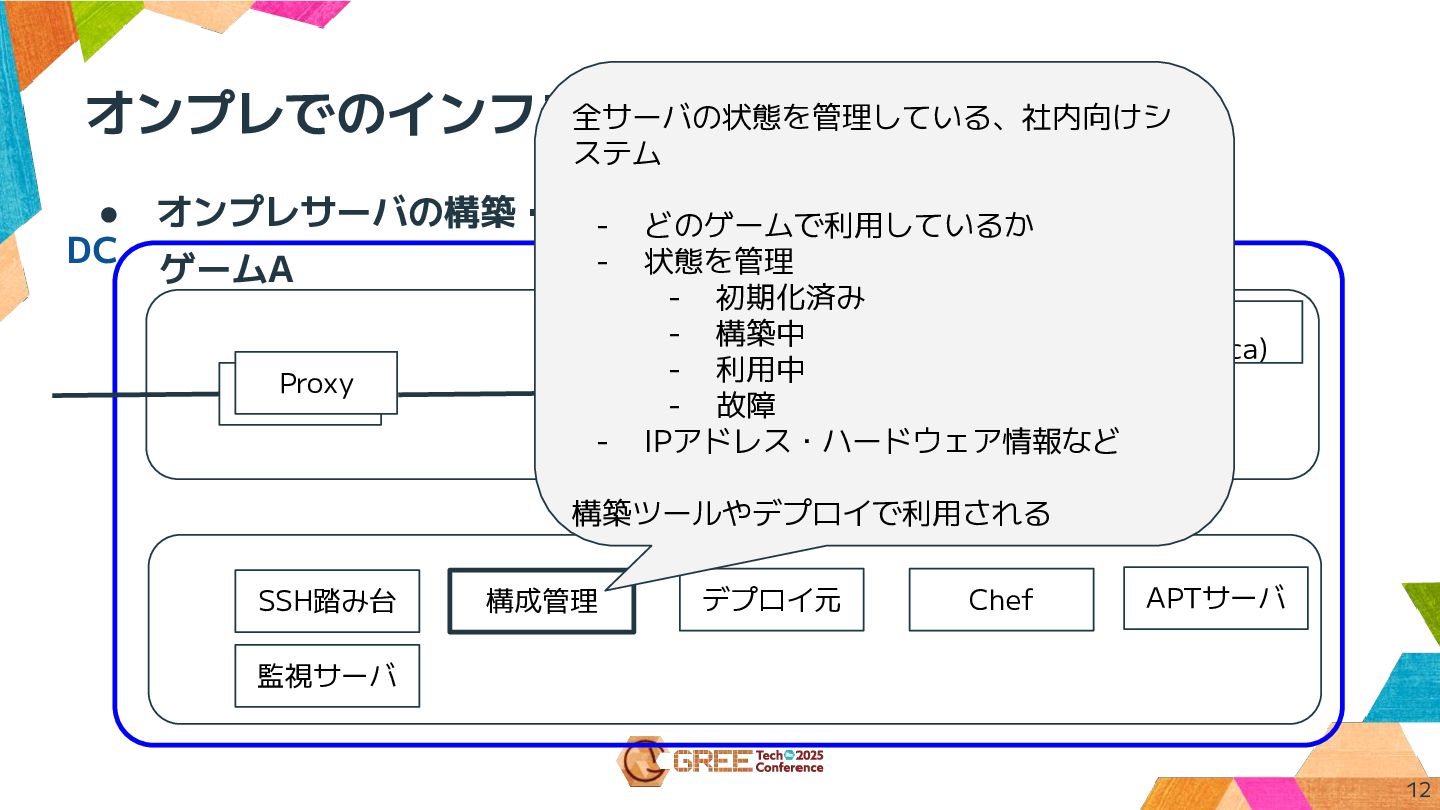 オンプレでのインフラ構成 11 • オンプレサーバの構築・デプロイのために管理サーバもいる ゲームA Proxy Webサーバ DB (Replica) KVS