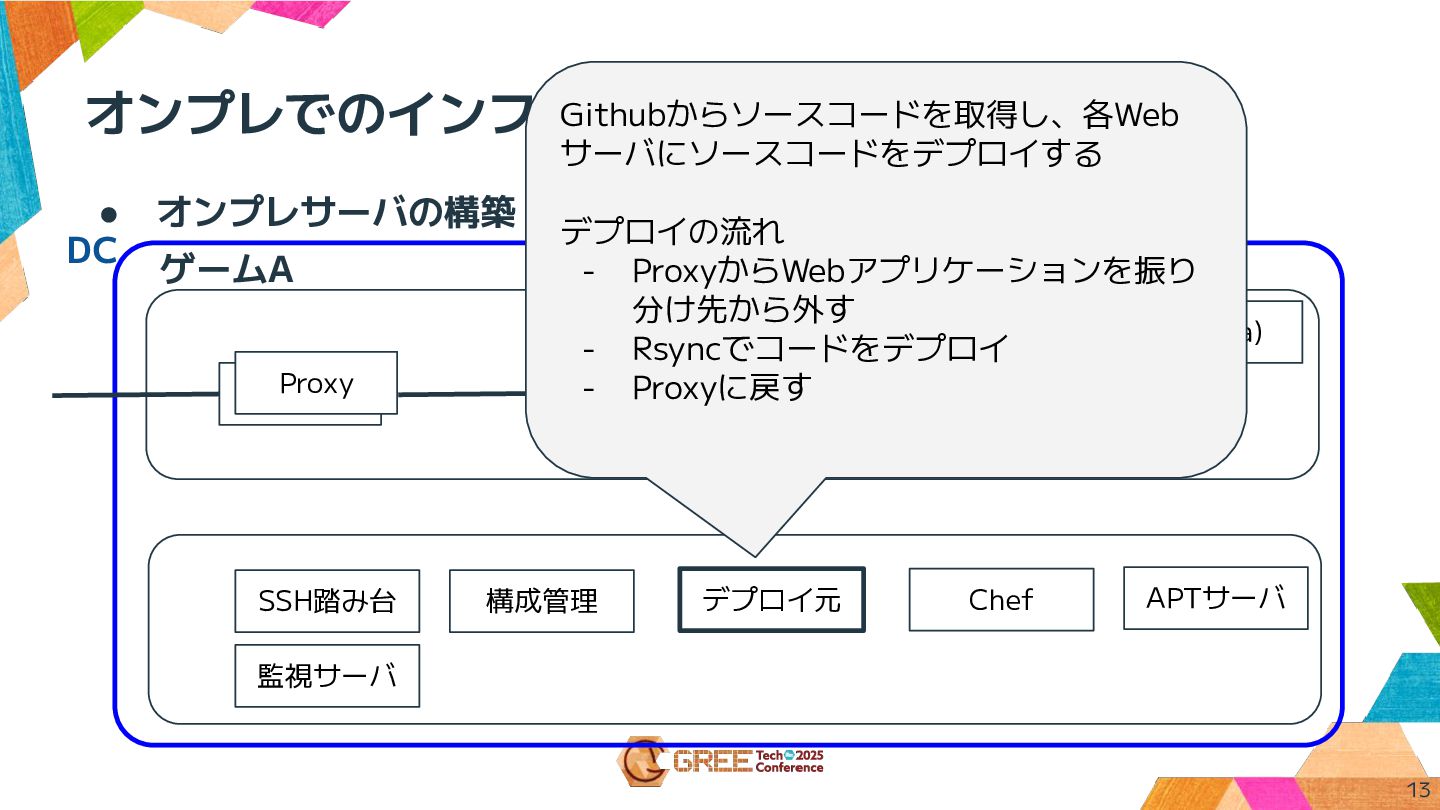 オンプレでのインフラ構成 12 • オンプレサーバの構築・デプロイのために管理サーバもいる ゲームA Proxy Webサーバ DB (Replica) KVS