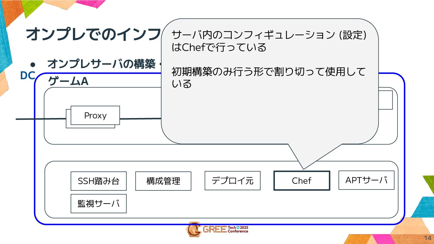 オンプレでのインフラ構成 13 • オンプレサーバの構築・デプロイのために管理サーバもいる ゲームA Proxy Webサーバ Replica) KVS (Flare)