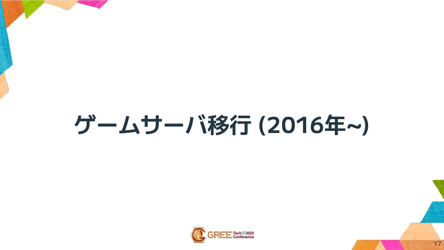 クラウド移行タイムライン 16 • ~2014 データセンタ(オンプレ)でGREEサービス群を運用 • 消滅都市(2014リリース)においてクラウドを採用するなど知見が蓄積され、 GREEサービスでも部分的にクラウドの移行を開始(GPUインスタンス) • 2016年頃ゲームサーバ