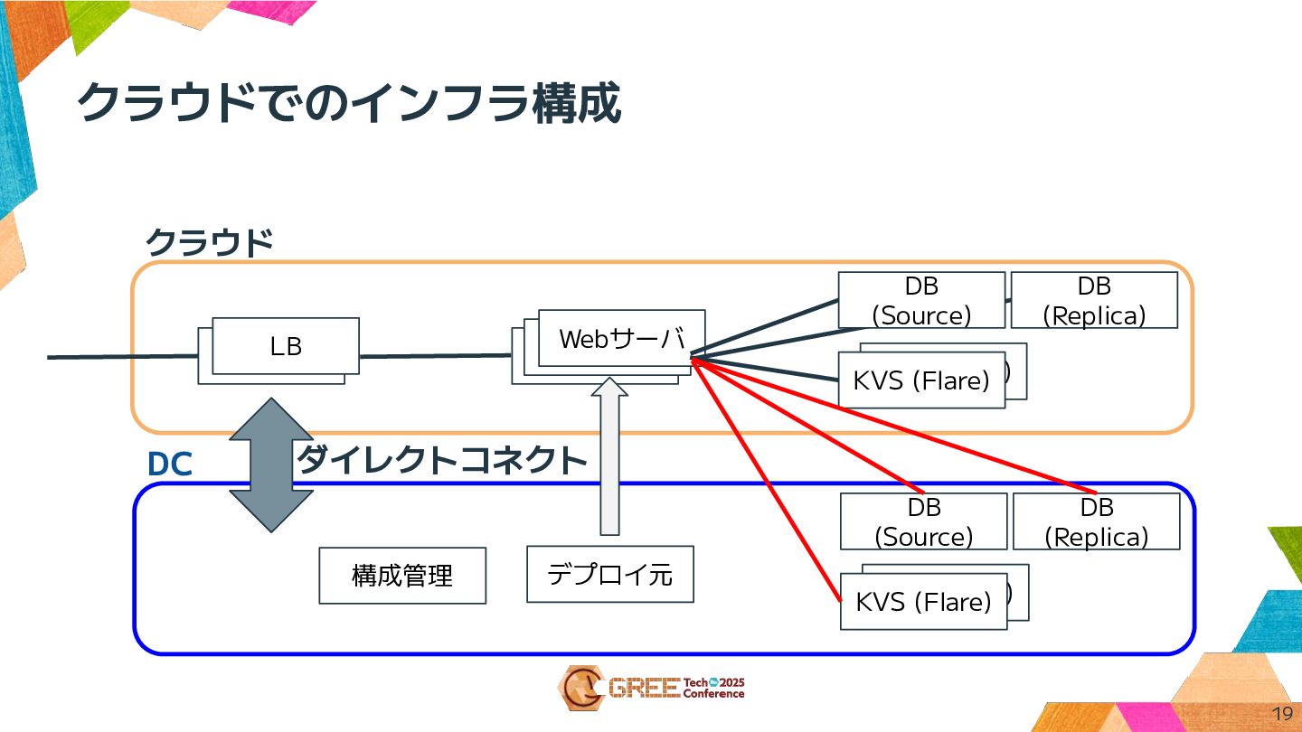(Flare) Webサーバ Webサーバ LB DB (Source) DB (Replica) KVS (Flare) KVS (Flare) DB (Source) DC ダイレクトコネクト 構成管理 デプロイ元
