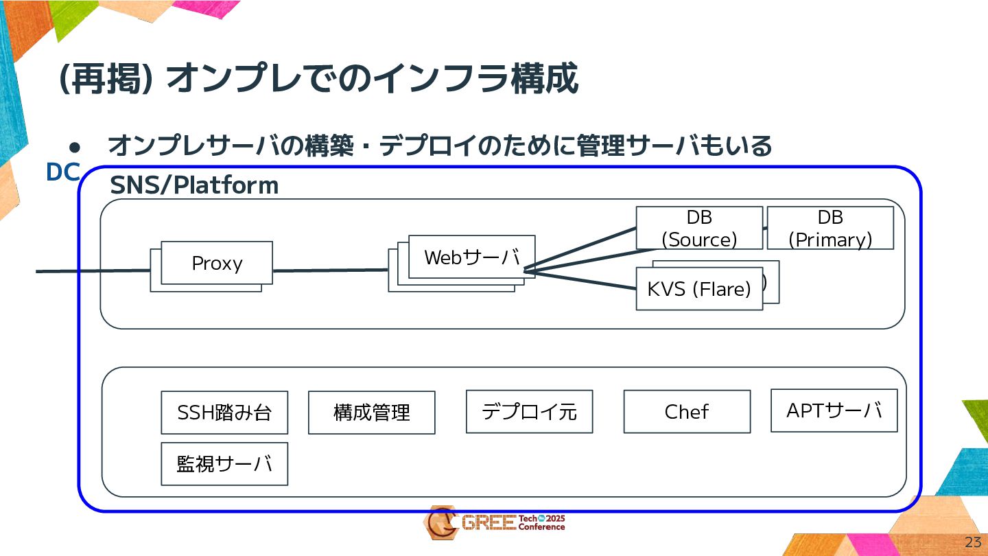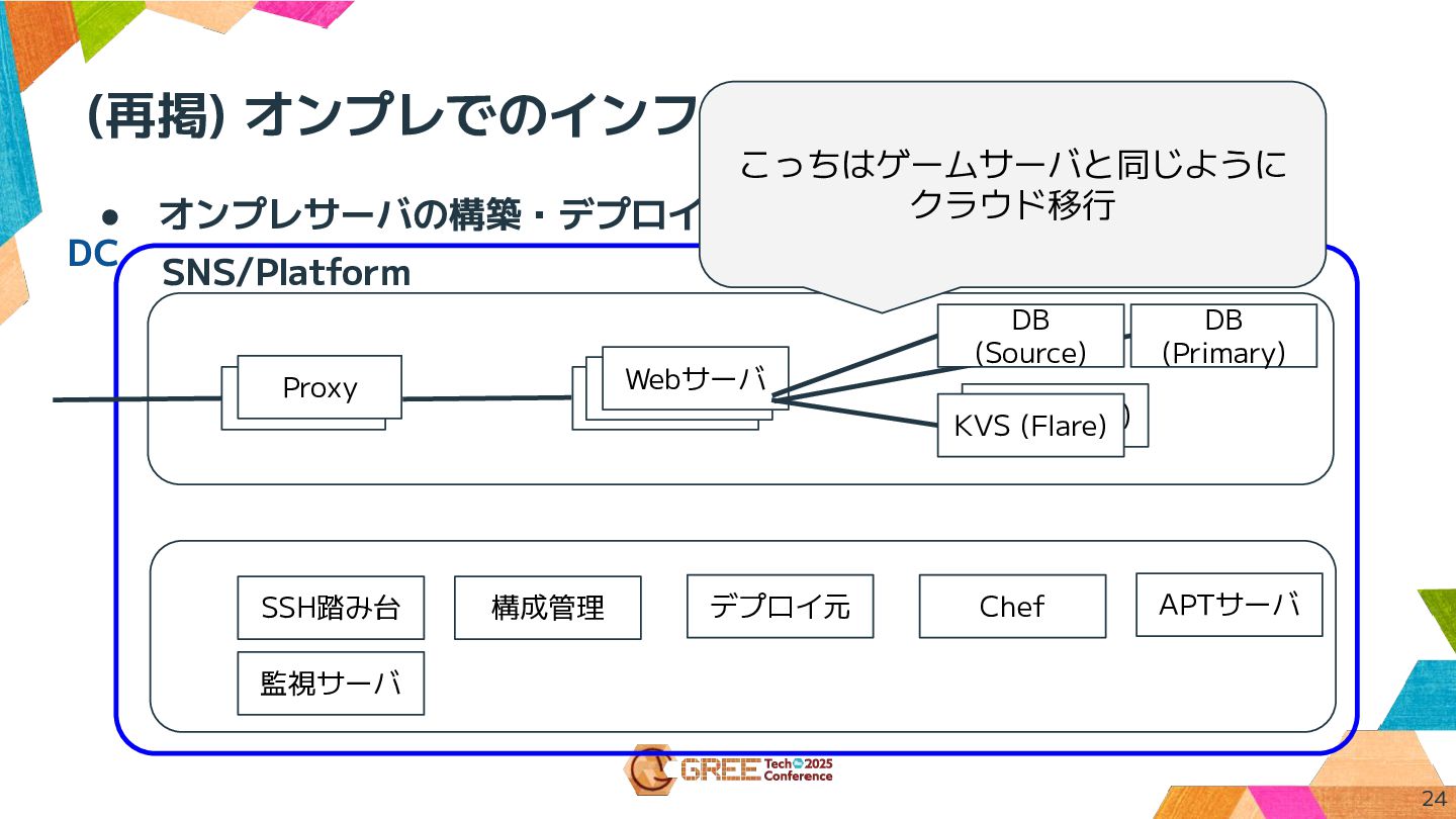 (再掲) オンプレでのインフラ構成 23 • オンプレサーバの構築・デプロイのために管理サーバもいる SNS/Platform Proxy Webサーバ DB (Primary)