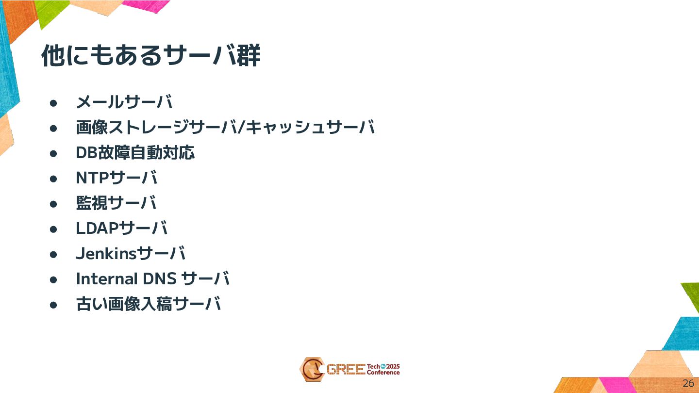 • 監視サーバ • LDAPサーバ • Jenkinsサーバ • Internal DNS サーバ • 古い画像入稿サーバ