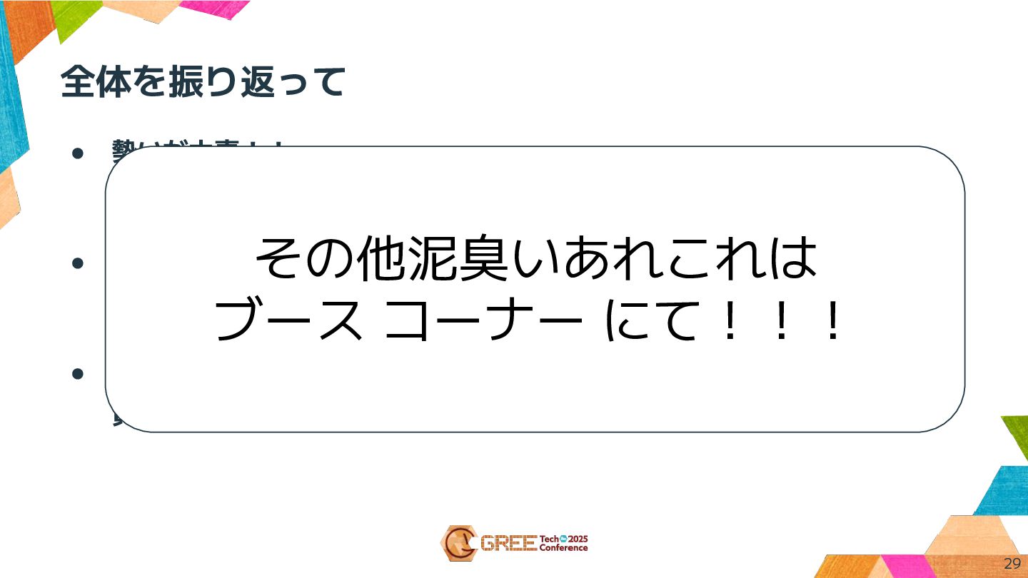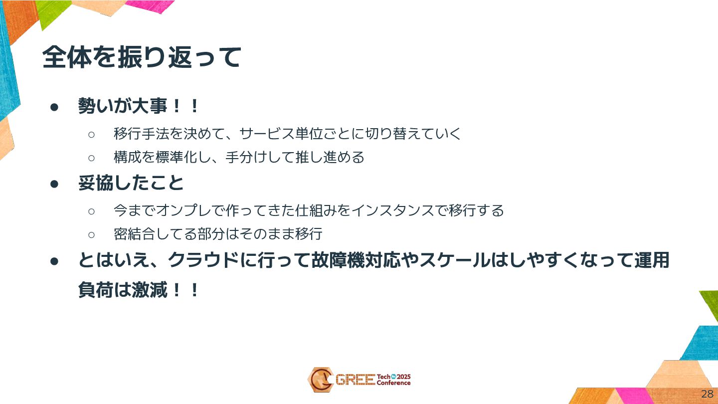 全体を振り返って 28 • 勢いが大事!! ◦ 移行手法を決めて、サービス単位ごとに切り替えていく ◦ 構成を標準化し、手分けして推し進める • 妥協したこと
