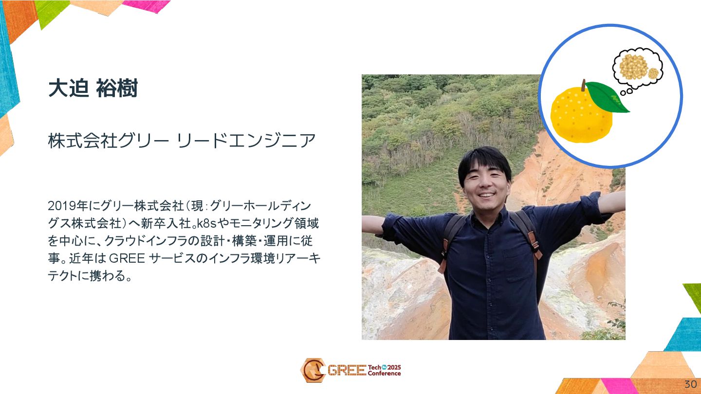 大迫 裕樹 2019年にグリー株式会社(現:グリーホールディン グス株式会社)へ新卒入社。 k8sやモニタリング領域 を中心に、クラウドインフラの設計・構築・運用に従 事。近年は GREE サービスのインフラ環境リアーキ テクトに携わる。