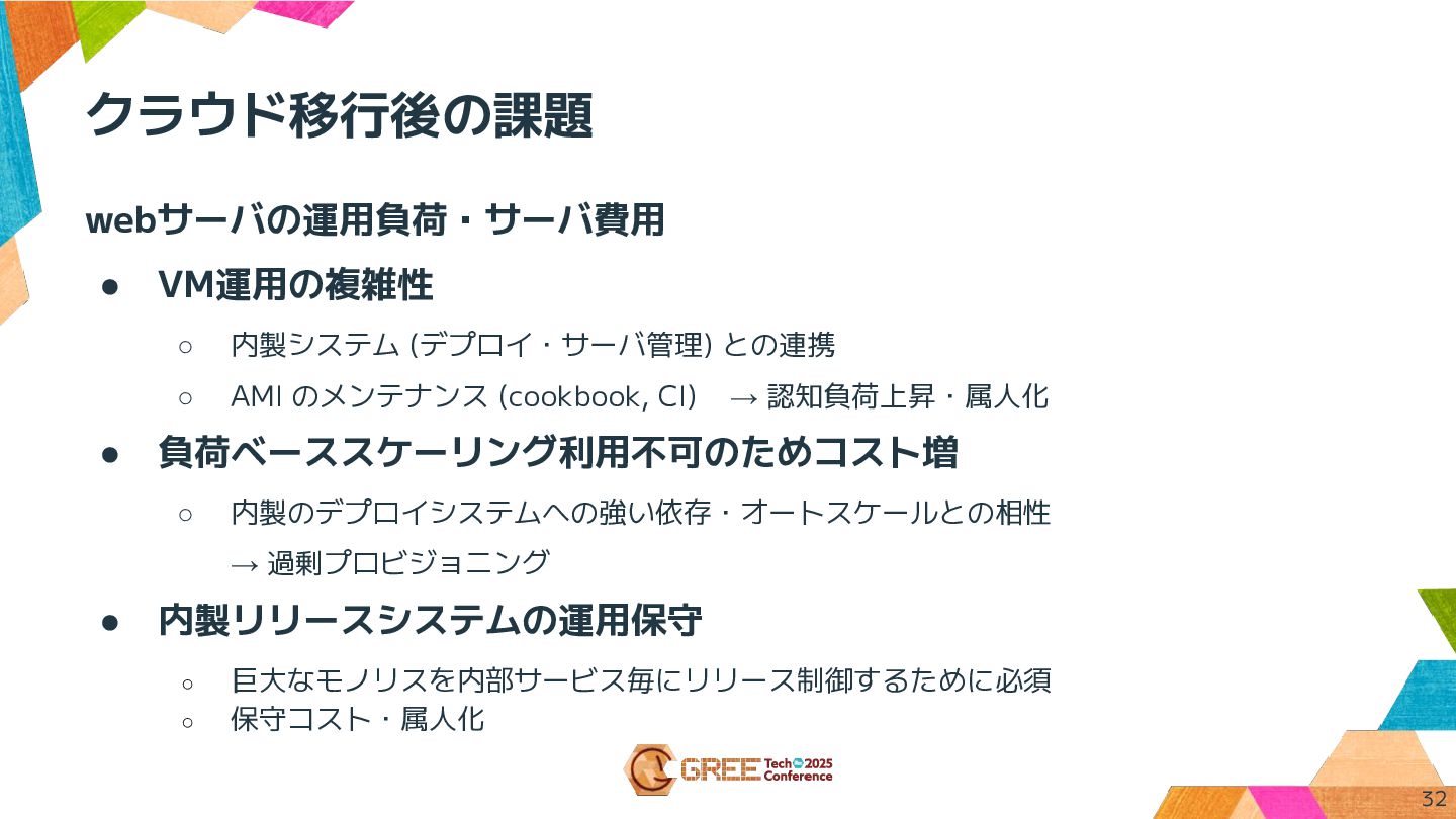 クラウド移行後の課題 webサーバの運用負荷・サーバ費用 • VM運用の複雑性 ◦ 内製システム (デプロイ・サーバ管理) との連携 ◦ AMI