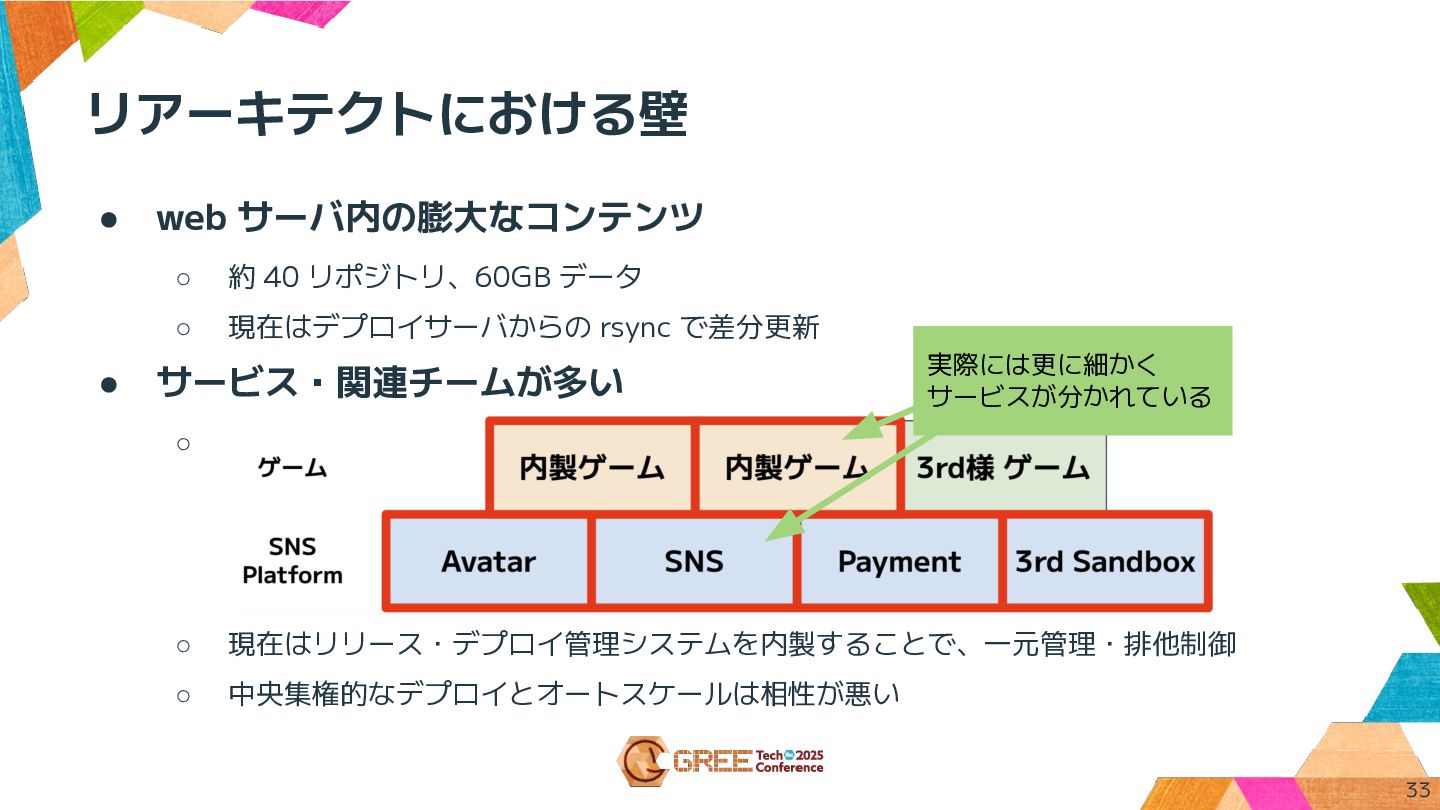 のメンテナンス (cookbook, CI) → 認知負荷上昇・属人化 • 負荷ベーススケーリング利用不可のためコスト増 ◦ 内製のデプロイシステムへの強い依存・オートスケールとの相性 → 過剰プロビジョニング • 内製リリースシステムの運用保守 ◦ 巨大なモノリスを内部サービス毎にリリース制御するために必須 ◦ 保守コスト・属人化 32