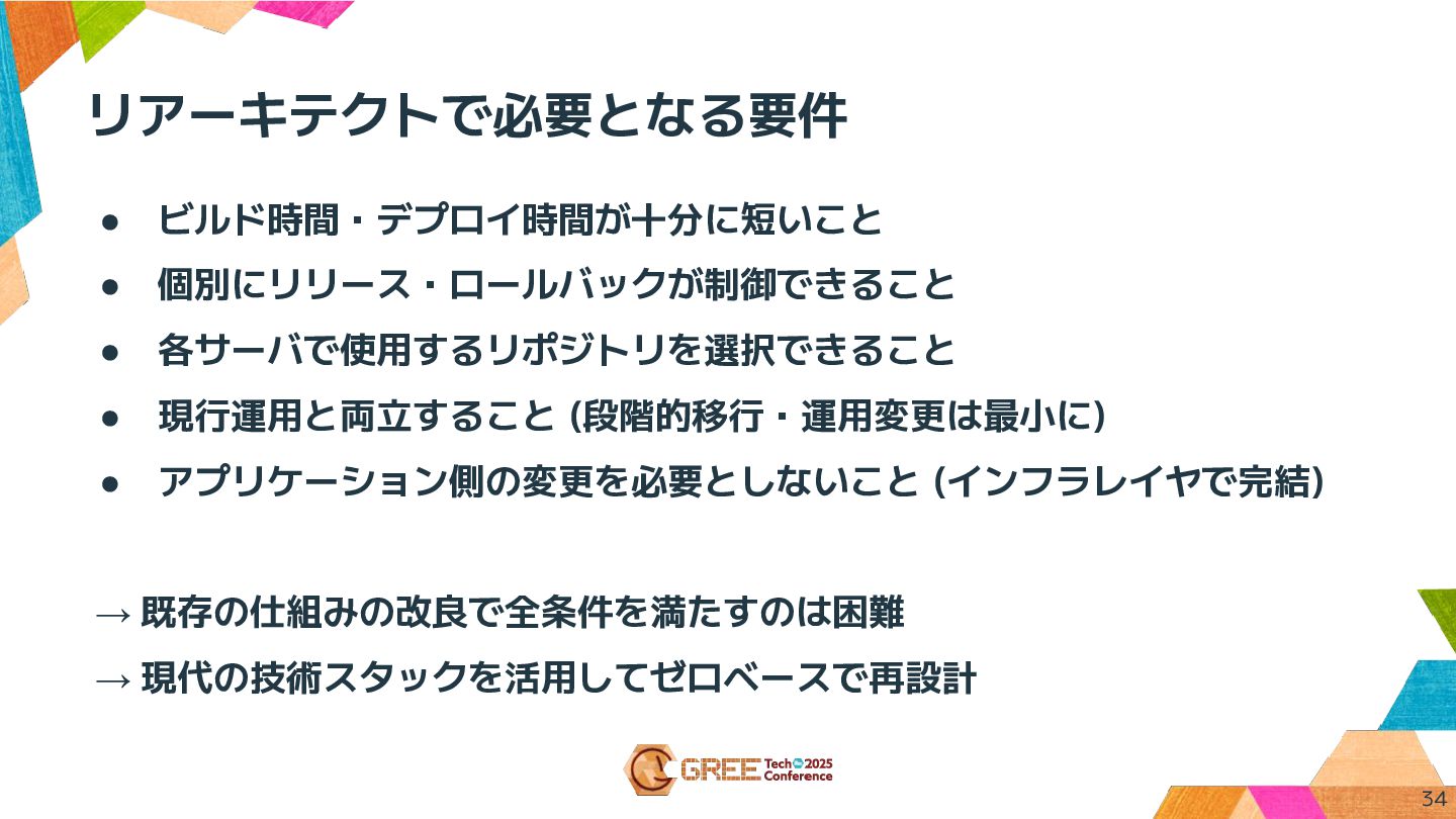 リアーキテクトで必要となる要件 • ビルド時間・デプロイ時間が十分に短いこと • 個別にリリース・ロールバックが制御できること • 各サーバで使用するリポジトリを選択できること • 現行運用と両立すること (段階的移行・運用変更は最小に)