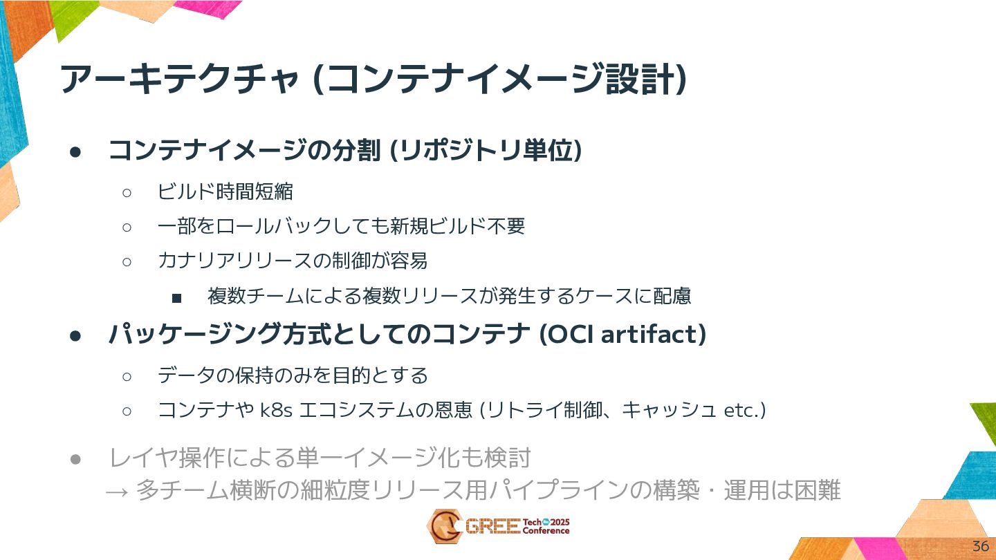 カナリアリリースの制御が容易 ▪ 複数チームによる複数リリースが発生するケースに配慮 • パッケージング方式としてのコンテナ (OCI artifact) ◦ データの保持のみを目的とする ◦ コンテナや k8s エコシステムの恩恵 (リトライ制御、キャッシュ etc.) • レイヤ操作による単一イメージ化も検討 → 多チーム横断の細粒度リリース用パイプラインの構築・運用は困難 36