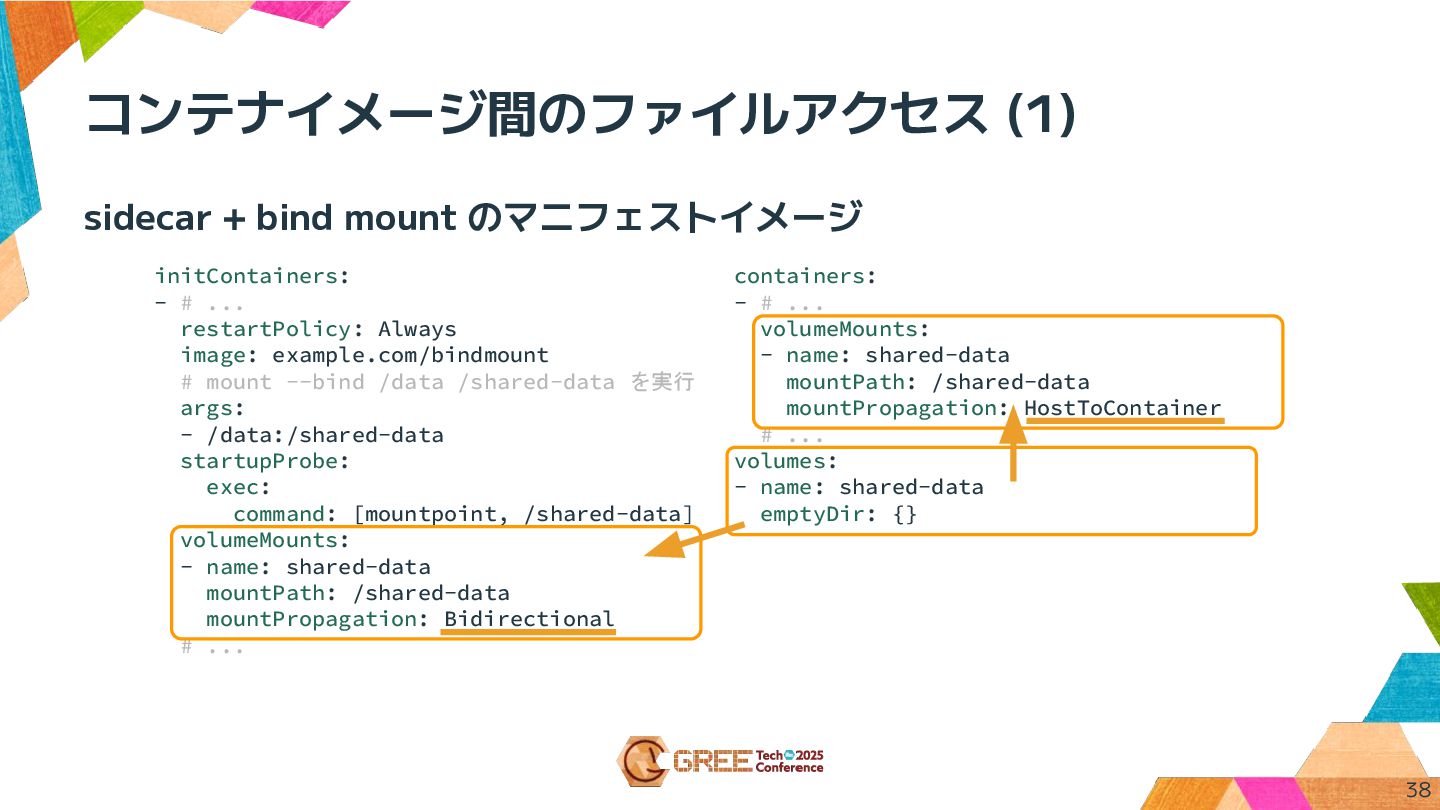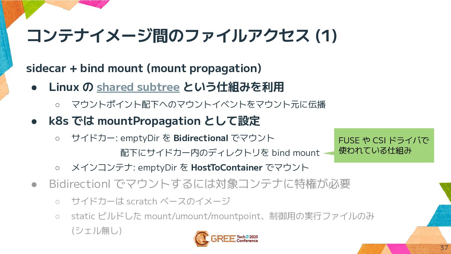 の shared subtree という仕組みを利用 ◦ マウントポイント配下へのマウントイベントをマウント元に伝播 • k8s では mountPropagation として設定 ◦ サイドカー: emptyDir を Bidirectional でマウント 配下にサイドカー内のディレクトリを bind mount ◦ メインコンテナ: emptyDir を HostToContainer でマウント • Bidirectionl でマウントするには対象コンテナに特権が必要 ◦ サイドカーは scratch ベースのイメージ ◦ static ビルドした mount/umount/mountpoint、制御用の実行ファイルのみ (シェル無し) 37 FUSE や CSI ドライバで 使われている仕組み