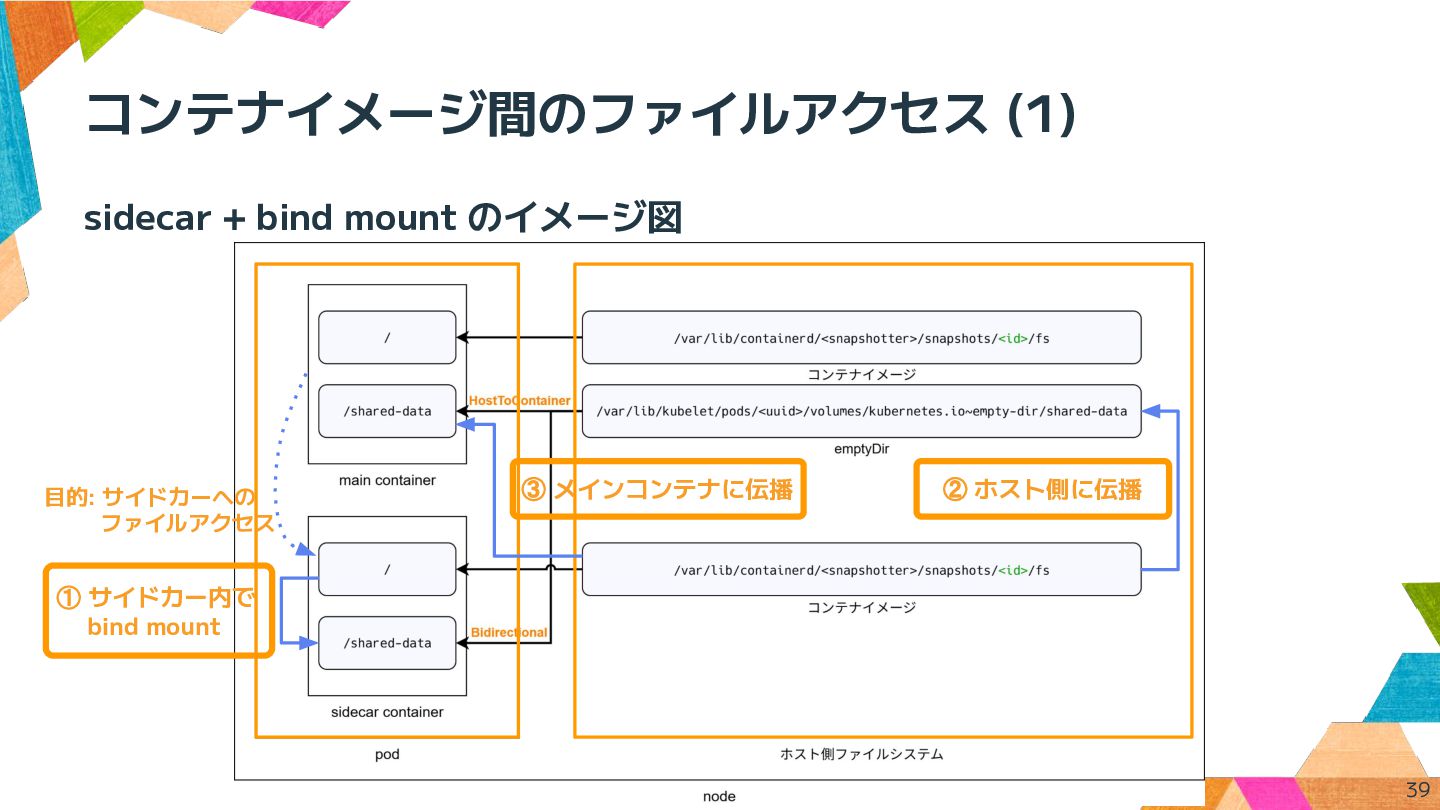 コンテナイメージ間のファイルアクセス (1) sidecar + bind mount のイメージ図 39 目的: サイドカーへの