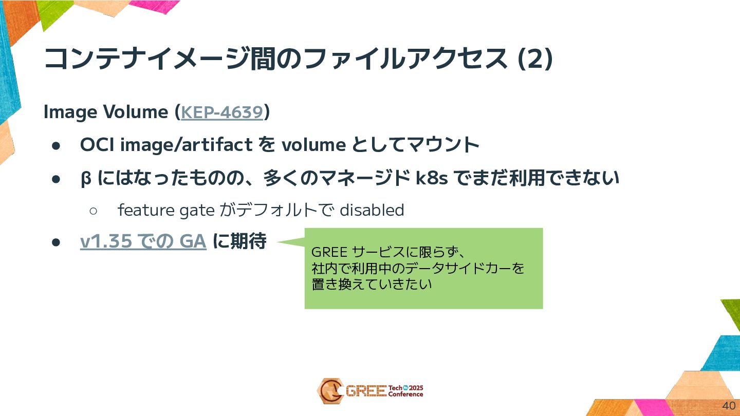 としてマウント • β にはなったものの、多くのマネージド k8s でまだ利用できない ◦ feature gate がデフォルトで disabled • v1.35 での GA に期待 40 GREE サービスに限らず、 社内で利用中のデータサイドカーを 置き換えていきたい