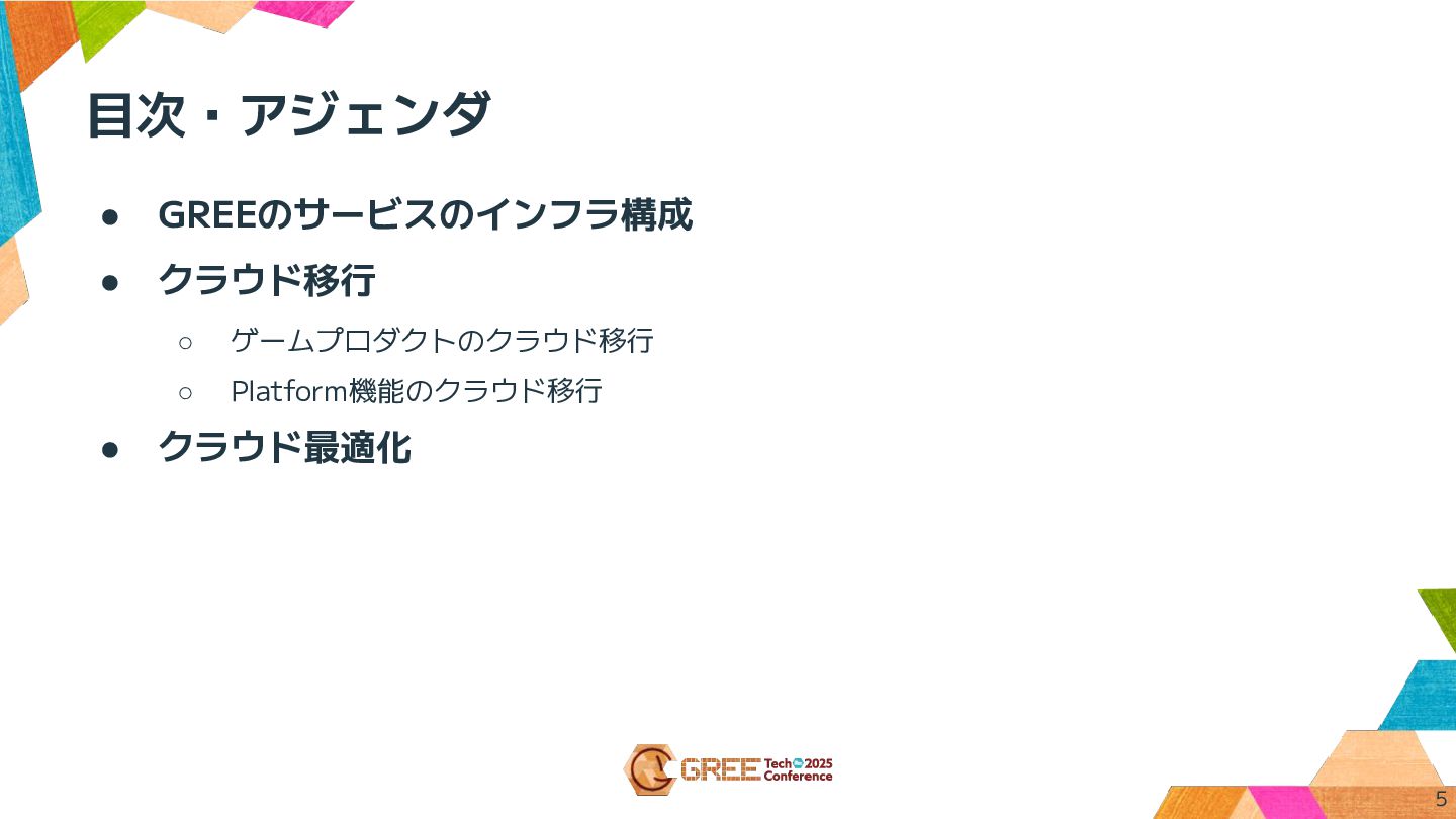 目次・アジェンダ • GREEのサービスのインフラ構成 • クラウド移行 ◦ ゲームプロダクトのクラウド移行 ◦ Platform機能のクラウド移行 •