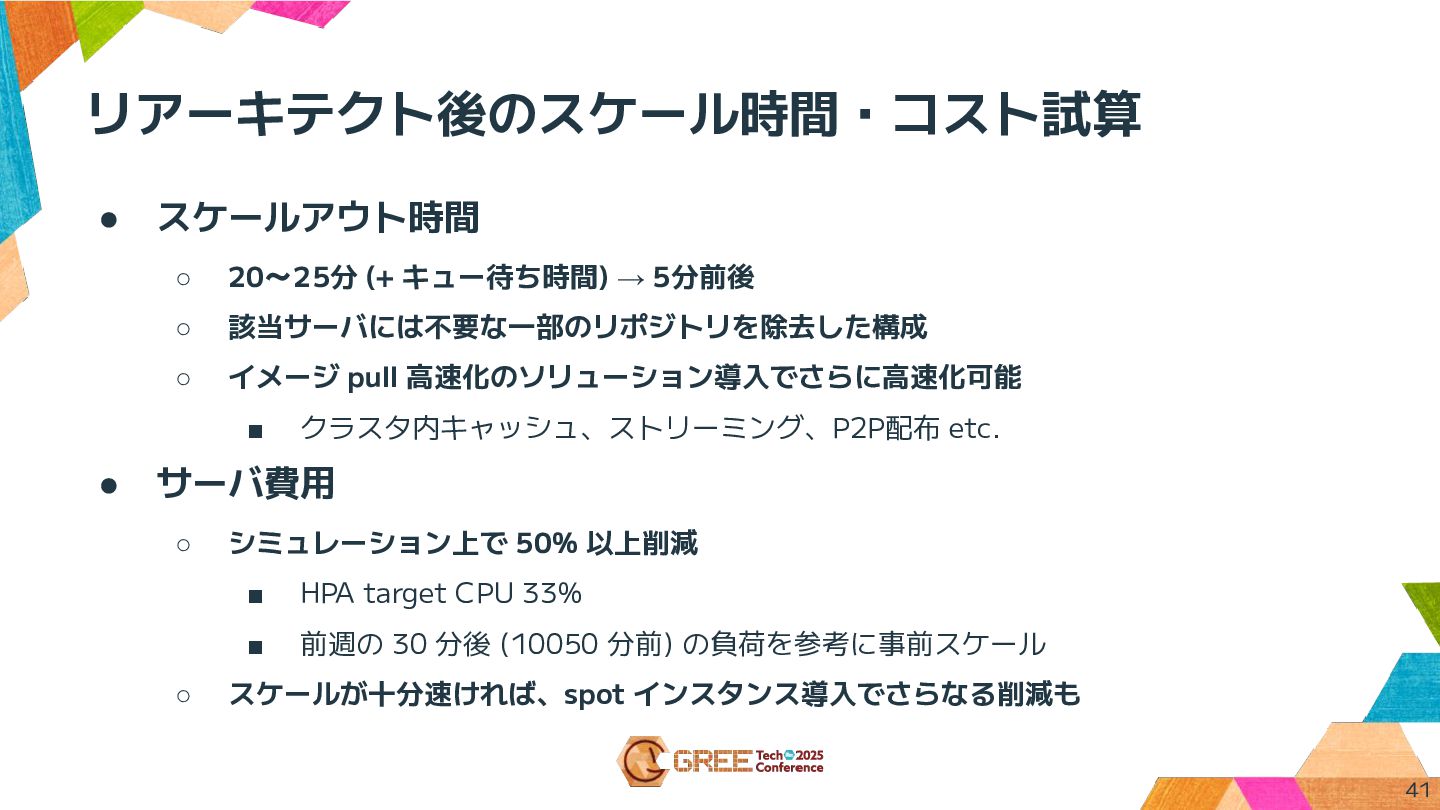 該当サーバには不要な一部のリポジトリを除去した構成 ◦ イメージ pull 高速化のソリューション導入でさらに高速化可能 ▪ クラスタ内キャッシュ、ストリーミング、P2P配布 etc. • サーバ費用 ◦ シミュレーション上で 50% 以上削減 ▪ HPA target CPU 33% ▪ 前週の 30 分後 (10050 分前) の負荷を参考に事前スケール ◦ スケールが十分速ければ、spot インスタンス導入でさらなる削減も 41