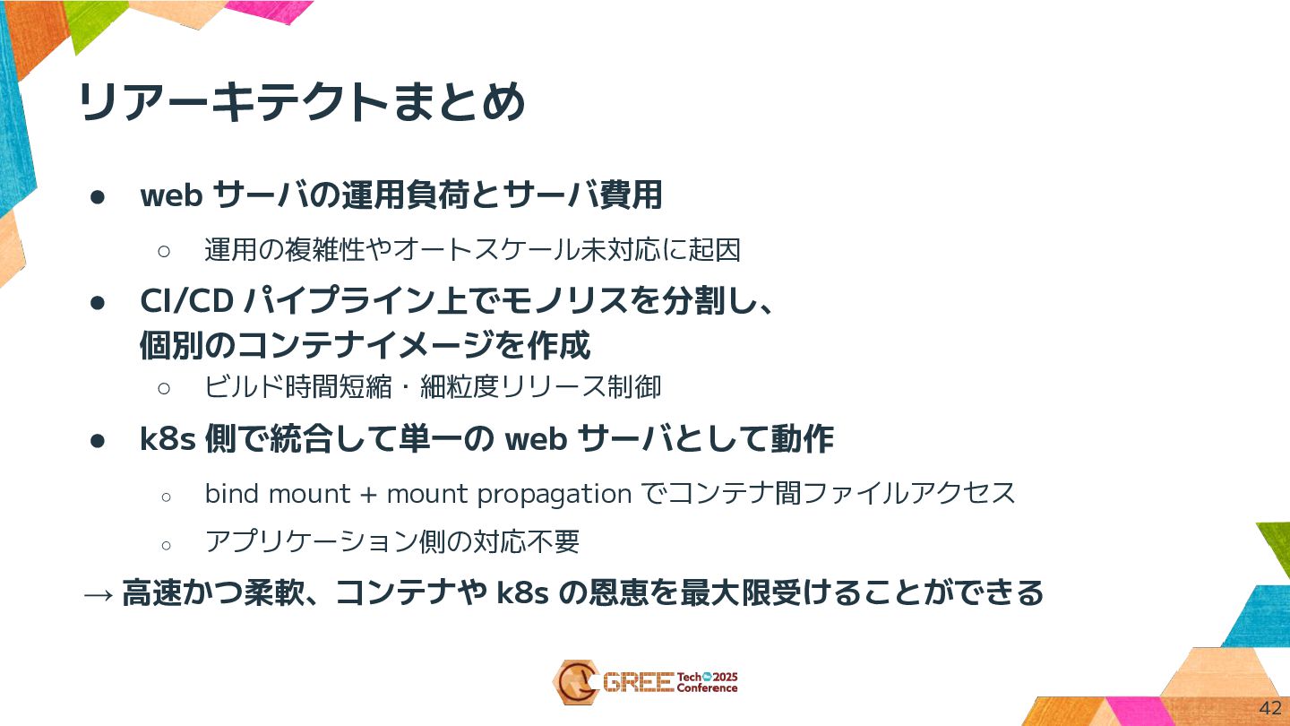 ◦ ビルド時間短縮・細粒度リリース制御 • k8s 側で統合して単一の web サーバとして動作 ◦ bind mount + mount propagation でコンテナ間ファイルアクセス ◦ アプリケーション側の対応不要 → 高速かつ柔軟、コンテナや k8s の恩恵を最大限受けることができる 42
