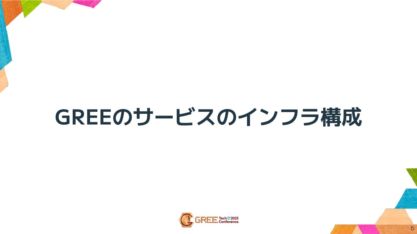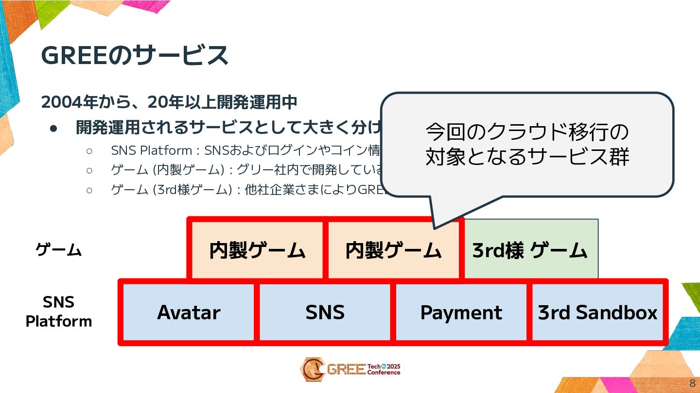 内製ゲーム SNS Platform ゲーム 2004年から、20年以上開発運用中 • 開発運用されるサービスとして大きく分けて3種類ある ◦ SNS Platform : SNSおよびログインやコイン情報、ユーザ情報を扱う ◦ ゲーム (内製ゲーム) : グリー社内で開発しているゲーム ◦ ゲーム (3rd様ゲーム) : 他社企業さまによりGREE Platform上で提供されるゲーム 今回のクラウド移行の 対象となるサービス群