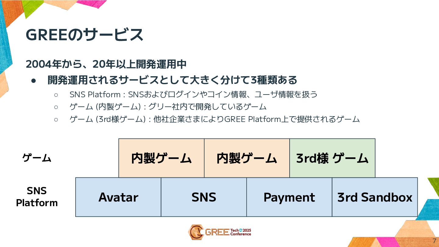 ゲーム SNS Platform ゲーム 2004年から、20年以上開発運用中 • 開発運用されるサービスとして大きく分けて3種類ある ◦ SNS Platform : SNSおよびログインやコイン情報、ユーザ情報を扱う ◦ ゲーム (内製ゲーム) : グリー社内で開発しているゲーム ◦ ゲーム (3rd様ゲーム) : 他社企業さまによりGREE Platform上で提供されるゲーム