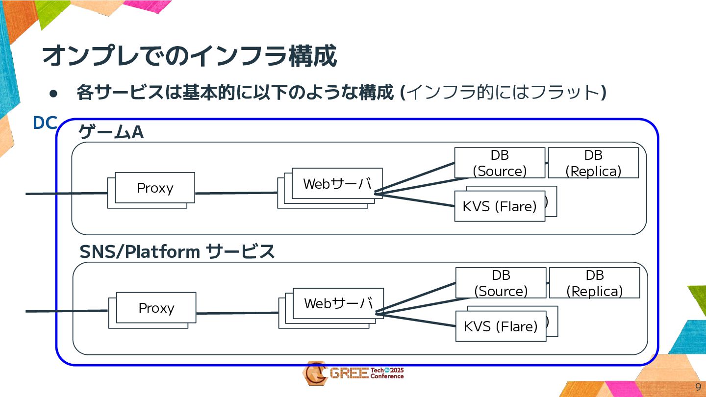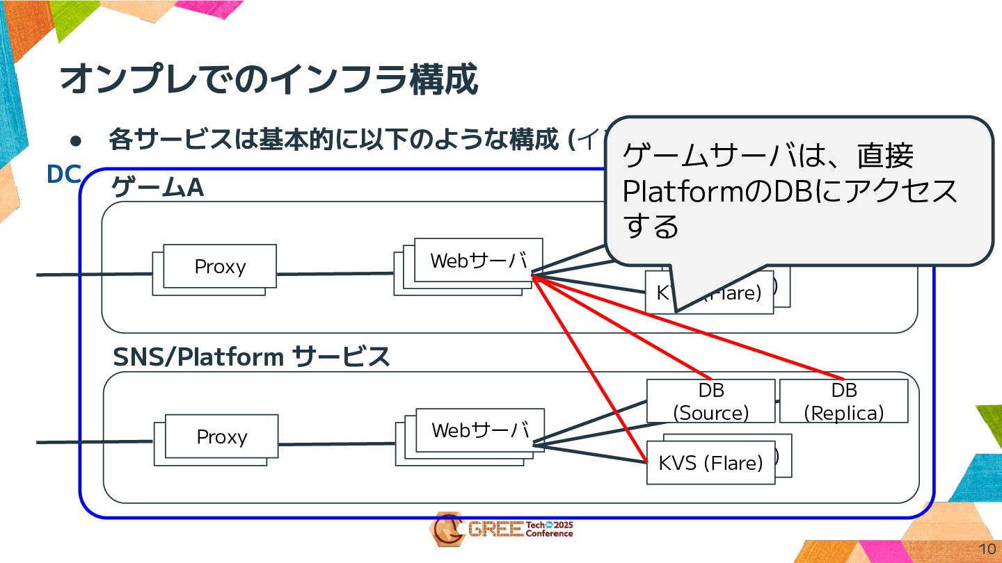 KVS (Flare) KVS (Flare) Webサーバ Webサーバ Proxy DB (Source) SNS/Platform サービス Proxy Webサーバ DB (Replica) KVS (Flare) KVS (Flare) Webサーバ Webサーバ Proxy DB (Source) ゲームサーバは、直接 PlatformのDBにアクセス する DC