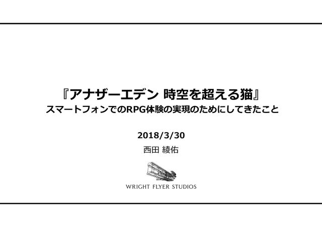 『アナザーエデン 時空を超える猫』 スマートフォンでのRPG体験の実現のためにしてきたこと 2018/3/30 ⻄⽥ 綾佑