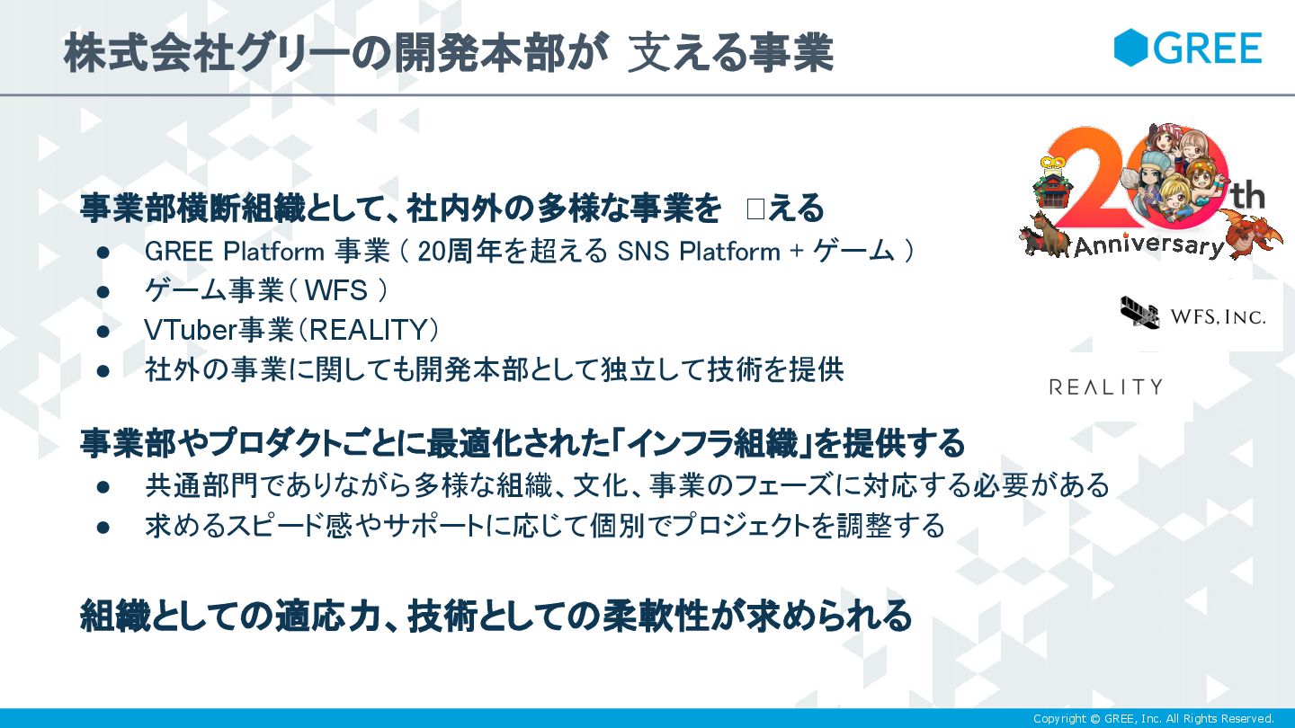 GREE Platform 事業 ( 20周年を超える SNS Platform + ゲーム ) • ゲーム事業( WFS ) • VTuber事業(REALITY) • 社外の事業に関しても開発本部として独立して技術を提供 株式会社グリーの開発本部が ⽀える事業 事業部やプロダクトごとに最適化された「インフラ組織」を提供する • 共通部門でありながら多様な組織、文化、事業のフェーズに対応する必要がある • 求めるスピード感やサポートに応じて個別でプロジェクトを調整する 組織としての適応力、技術としての柔軟性が求められる