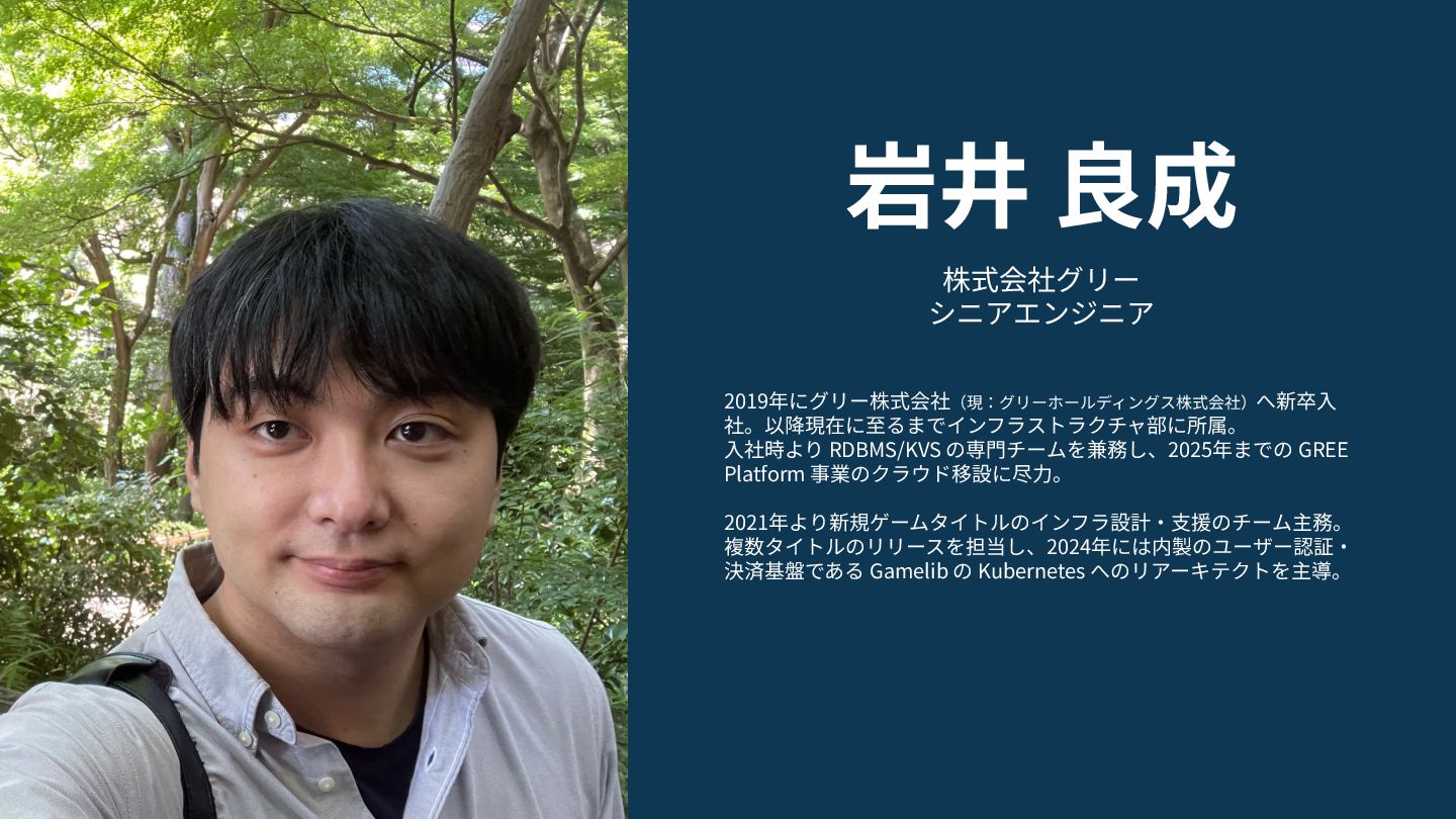 RDBMS/KVS の専⾨チームを兼務し、2025年までの GREE Platform 事業のクラウド移設に尽⼒。 2021年より新規ゲームタイトルのインフラ設計‧⽀援のチーム主務。 複数タイトルのリリースを担当し、2024年には内製のユーザー認証‧ 決済基盤である Gamelib の Kubernetes へのリアーキテクトを主導。 岩井 良成 株式会社グリー シニアエンジニア