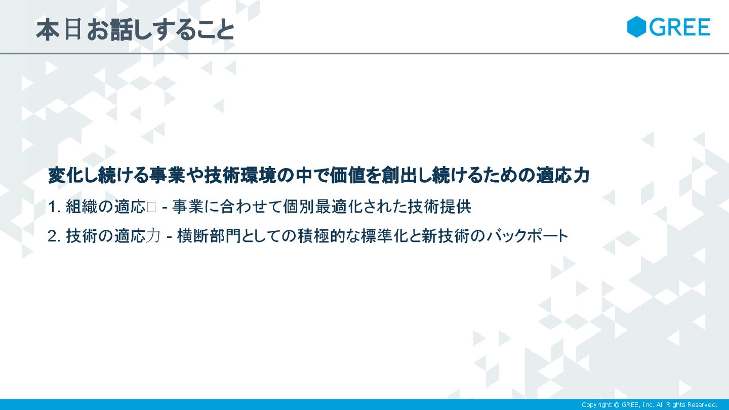 Copyright © GREE, Inc. All Rights Reserved. 本⽇お話しすること 変化し続ける事業や技術環境の中で価値を創出し続けるための適応力