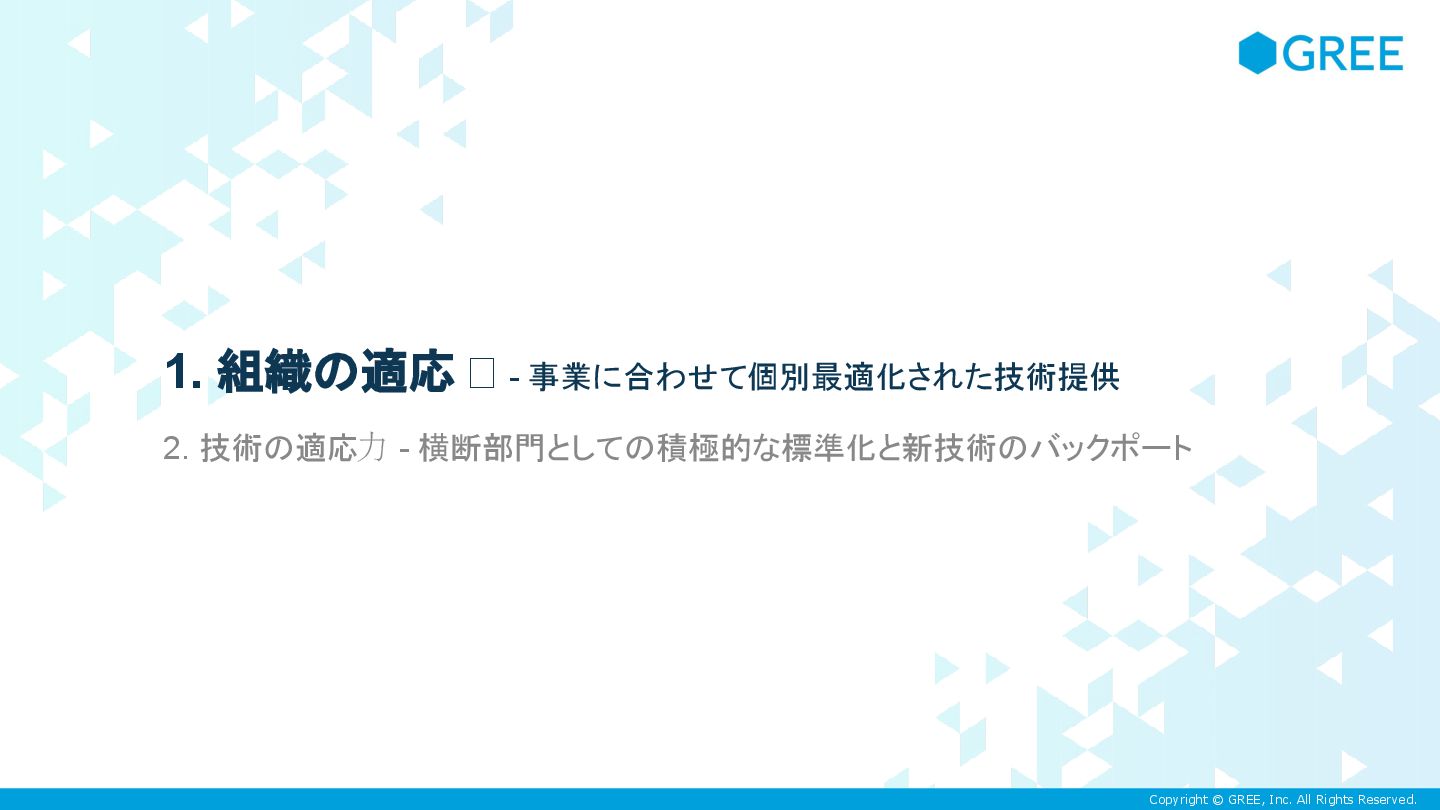 Copyright © GREE, Inc. All Rights Reserved. 1. 組織の適応⼒ -