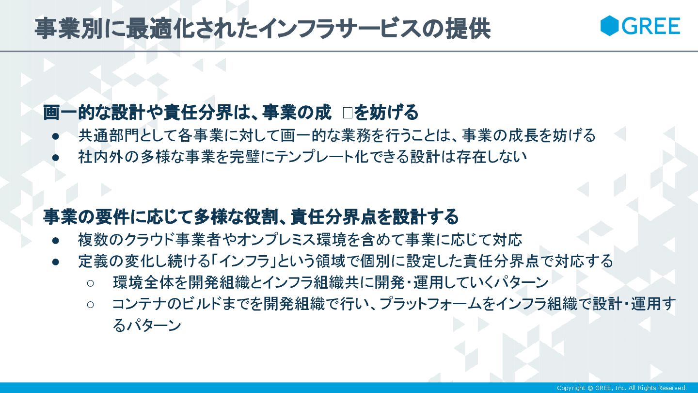 Copyright © GREE, Inc. All Rights Reserved. 事業別に最適化されたインフラサービスの提供 画一的な設計や責任分界は、事業の成