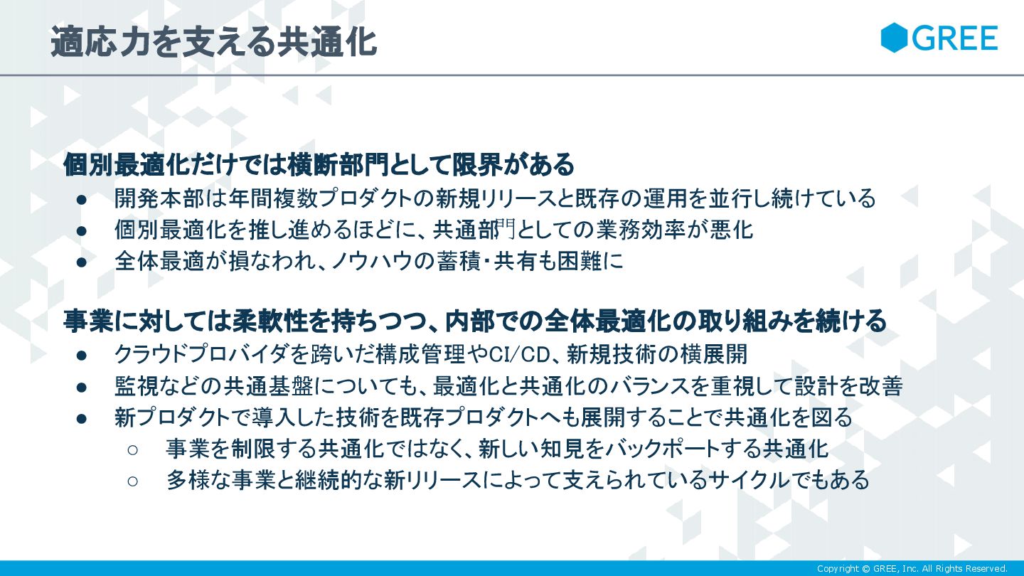 • 開発本部は年間複数プロダクトの新規リリースと既存の運用を並行し続けている • 個別最適化を推し進めるほどに、共通部 ⾨としての業務効率が悪化 • 全体最適が損なわれ、ノウハウの蓄積・共有も困難に 事業に対しては柔軟性を持ちつつ、内部での全体最適化の取り組みを続ける • クラウドプロバイダを跨いだ構成管理やCI/CD、新規技術の横展開 • 監視などの共通基盤についても、最適化と共通化のバランスを重視して設計を改善 • 新プロダクトで導入した技術を既存プロダクトへも展開することで共通化を図る ◦ 事業を制限する共通化ではなく、新しい知見をバックポートする共通化 ◦ 多様な事業と継続的な新リリースによって支えられているサイクルでもある