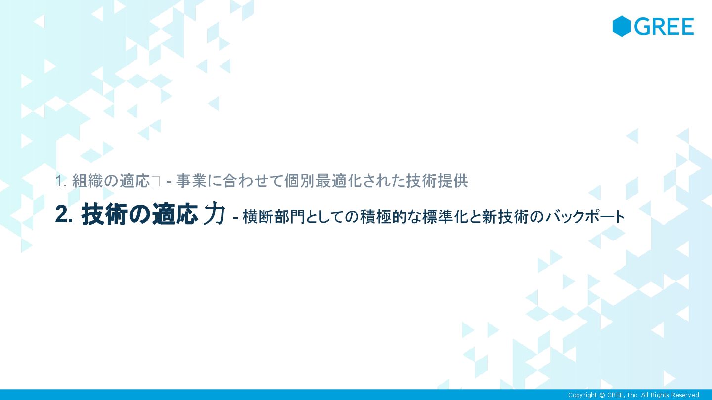 - 事業に合わせて個別最適化された技術提供 2. 技術の適応⼒ - 横断部門としての積極的な標準化と新技術のバックポート