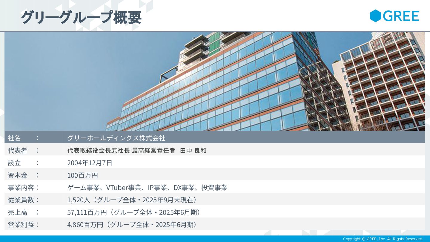 グリーホールディングス株式会社 代表者 : 代表取締役会長兼社長 最高経営責任者 田中 良和 設⽴ : 2004年12⽉7⽇ 資本⾦ : 100百万円 事業内容: ゲーム事業、VTuber事業、IP事業、DX事業、投資事業 従業員数: 1,520⼈(グループ全体‧2025年9⽉末現在) 売上⾼ : 57,111百万円(グループ全体‧2025年6⽉期) 営業利益: 4,860百万円(グループ全体‧2025年6⽉期)