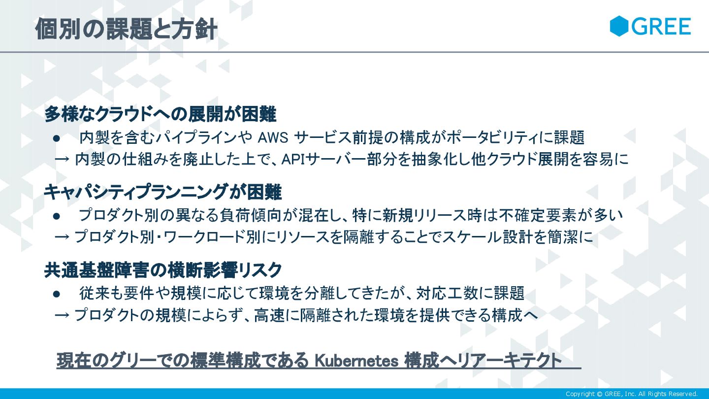 • 内製を含むパイプラインや AWS サービス前提の構成がポータビリティに課題 → 内製の仕組みを廃止した上で、APIサーバー部分を抽象化し他クラウド展開を容易に 共通基盤障害の横断影響リスク • 従来も要件や規模に応じて環境を分離してきたが、対応工数に課題 → プロダクトの規模によらず、高速に隔離された環境を提供できる構成へ キャパシティプランニングが困難 • プロダクト別の異なる負荷傾向が混在し、特に新規リリース時は不確定要素が多い → プロダクト別・ワークロード別にリソースを隔離することでスケール設計を簡潔に 現在のグリーでの標準構成である Kubernetes 構成へリアーキテクト