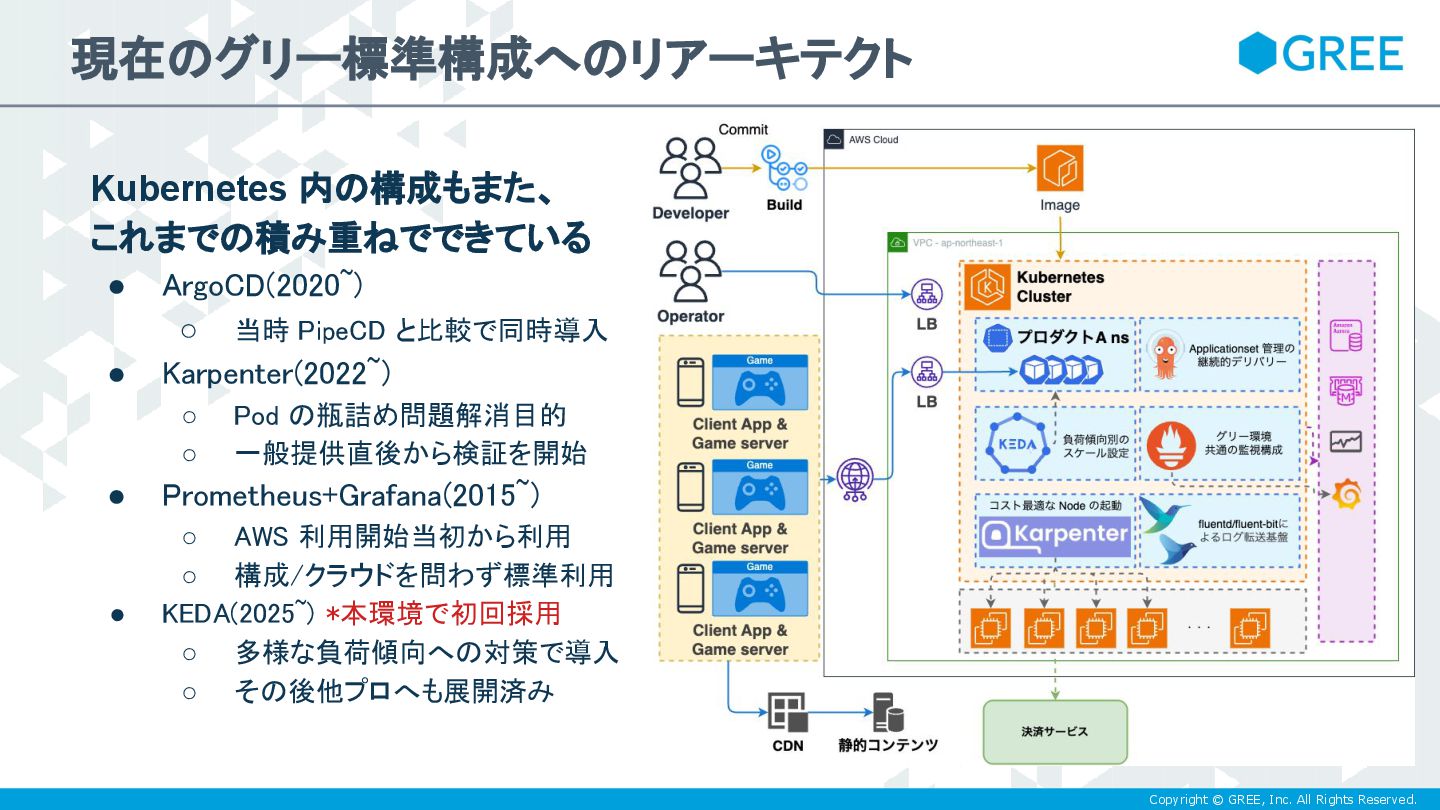 内の構成もまた、 これまでの積み重ねでできている • ArgoCD(2020~) ◦ 当時 PipeCD と比較で同時導入 • Karpenter(2022~) ◦ Pod の瓶詰め問題解消目的 ◦ 一般提供直後から検証を開始 • Prometheus+Grafana(2015~) ◦ AWS 利用開始当初から利用 ◦ 構成/クラウドを問わず標準利用 • KEDA(2025~) *本環境で初回採用 ◦ 多様な負荷傾向への対策で導入 ◦ その後他プロへも展開済み