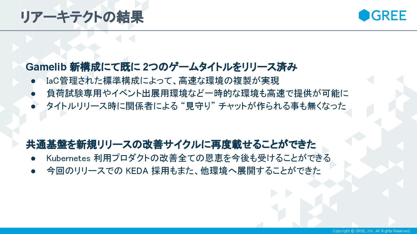 新構成にて既に 2つのゲームタイトルをリリース済み • IaC管理された標準構成によって、高速な環境の複製が実現 • 負荷試験専用やイベント出展用環境など一時的な環境も高速で提供が可能に • タイトルリリース時に関係者による “見守り” チャットが作られる事も無くなった 共通基盤を新規リリースの改善サイクルに再度載せることができた • Kubernetes 利用プロダクトの改善全ての恩恵を今後も受けることができる • 今回のリリースでの KEDA 採用もまた、他環境へ展開することができた