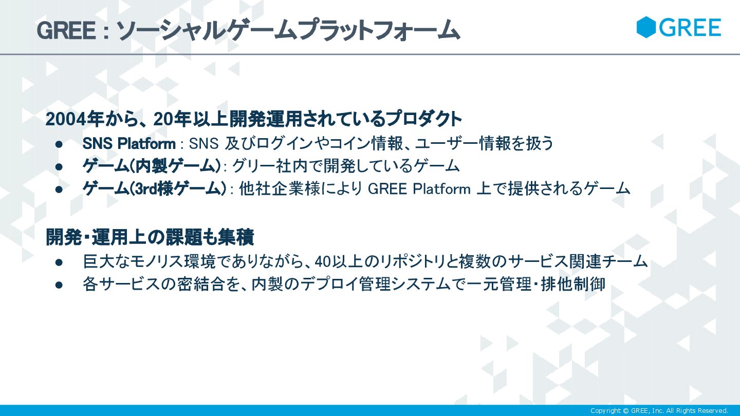 2004年から、20年以上開発運用されているプロダクト • SNS Platform : SNS 及びログインやコイン情報、ユーザー情報を扱う • ゲーム(内製ゲーム) : グリー社内で開発しているゲーム • ゲーム(3rd様ゲーム) : 他社企業様により GREE Platform 上で提供されるゲーム 開発・運用上の課題も集積 • 巨大なモノリス環境でありながら、40以上のリポジトリと複数のサービス関連チーム • 各サービスの密結合を、内製のデプロイ管理システムで一元管理・排他制御