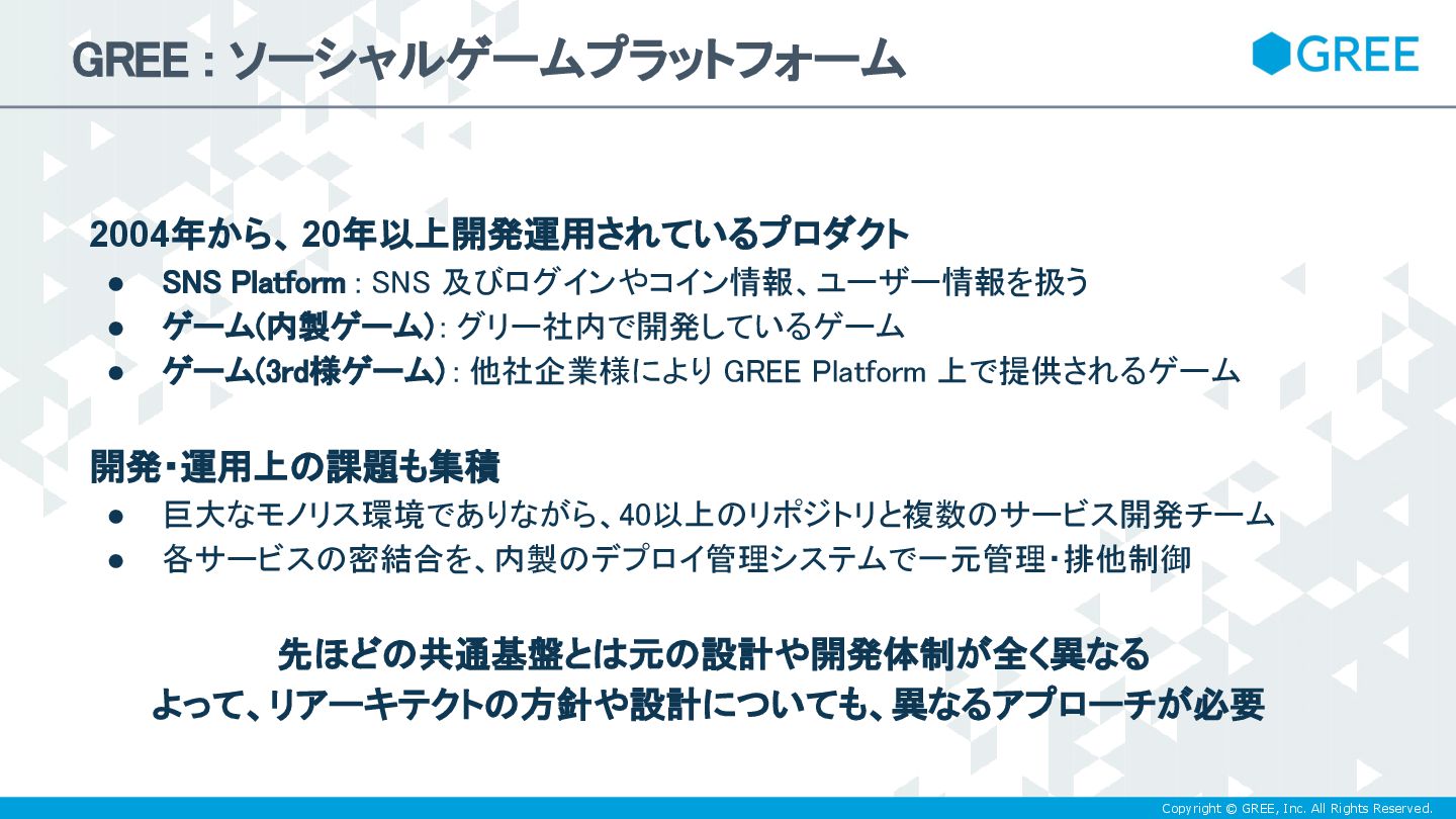 2004年から、20年以上開発運用されているプロダクト • SNS Platform : SNS 及びログインやコイン情報、ユーザー情報を扱う • ゲーム(内製ゲーム) : グリー社内で開発しているゲーム • ゲーム(3rd様ゲーム) : 他社企業様により GREE Platform 上で提供されるゲーム 開発・運用上の課題も集積 • 巨大なモノリス環境でありながら、40以上のリポジトリと複数のサービス開発チーム • 各サービスの密結合を、内製のデプロイ管理システムで一元管理・排他制御 先ほどの共通基盤とは元の設計や開発体制が全く異なる よって、リアーキテクトの方針や設計についても、異なるアプローチが必要