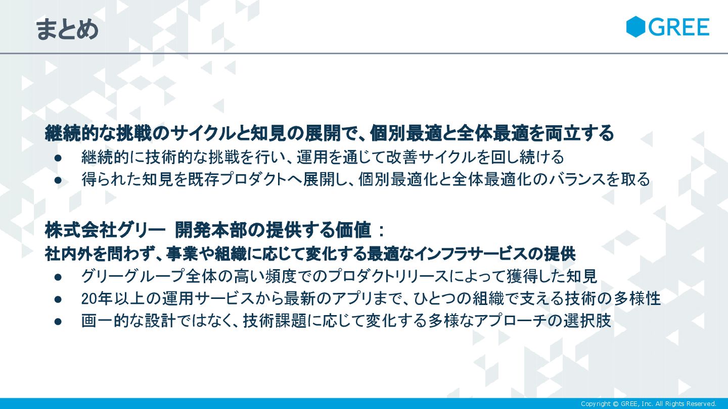 : 社内外を問わず、事業や組織に応じて変化する最適なインフラサービスの提供 • グリーグループ全体の高い頻度でのプロダクトリリースによって獲得した知見 • 20年以上の運用サービスから最新のアプリまで、ひとつの組織で支える技術の多様性 • 画一的な設計ではなく、技術課題に応じて変化する多様なアプローチの選択肢 継続的な挑戦のサイクルと知見の展開で、個別最適と全体最適を両立する • 継続的に技術的な挑戦を行い、運用を通じて改善サイクルを回し続ける • 得られた知見を既存プロダクトへ展開し、個別最適化と全体最適化のバランスを取る