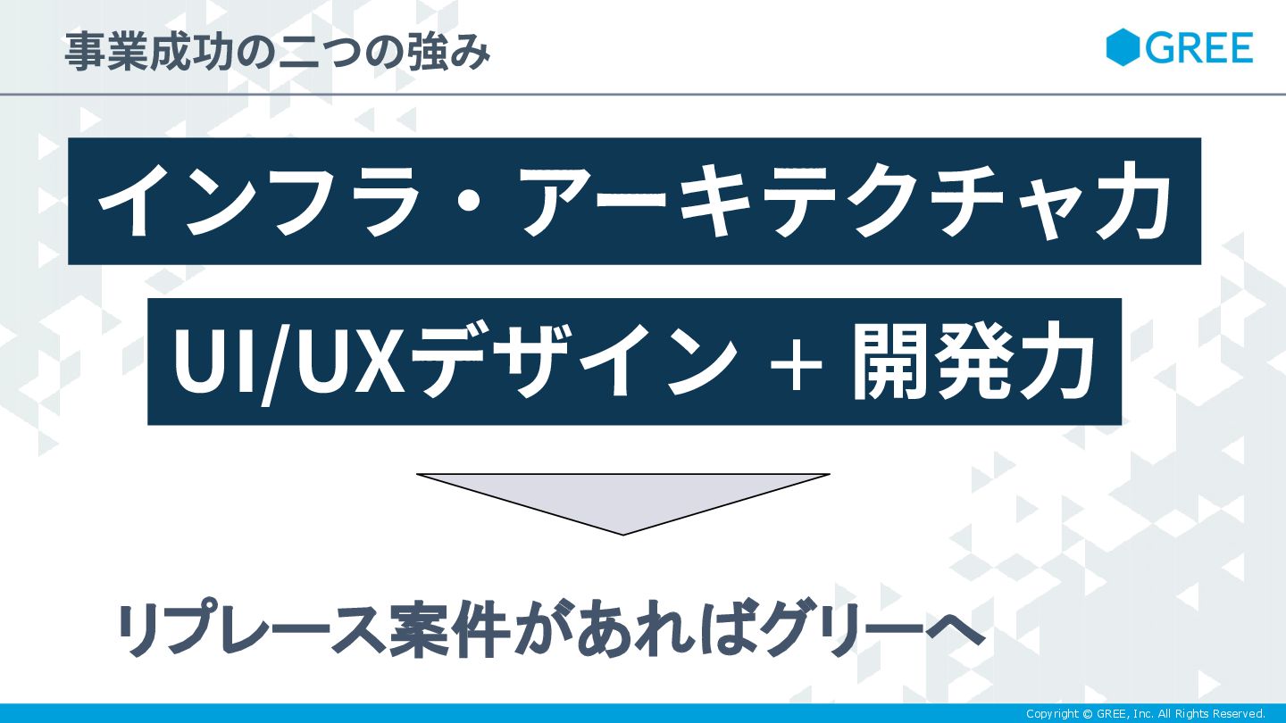 Copyright © GREE, Inc. All Rights Reserved. 事業成功の⼆つの強み インフラ‧アーキテクチャ⼒ UI/UXデザイン