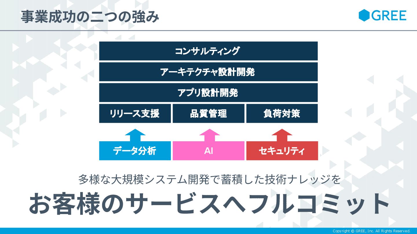 Copyright © GREE, Inc. All Rights Reserved. 事業成功の⼆つの強み 多様な⼤規模システム開発で蓄積した技術ナレッジを お客様のサービスへフルコミット