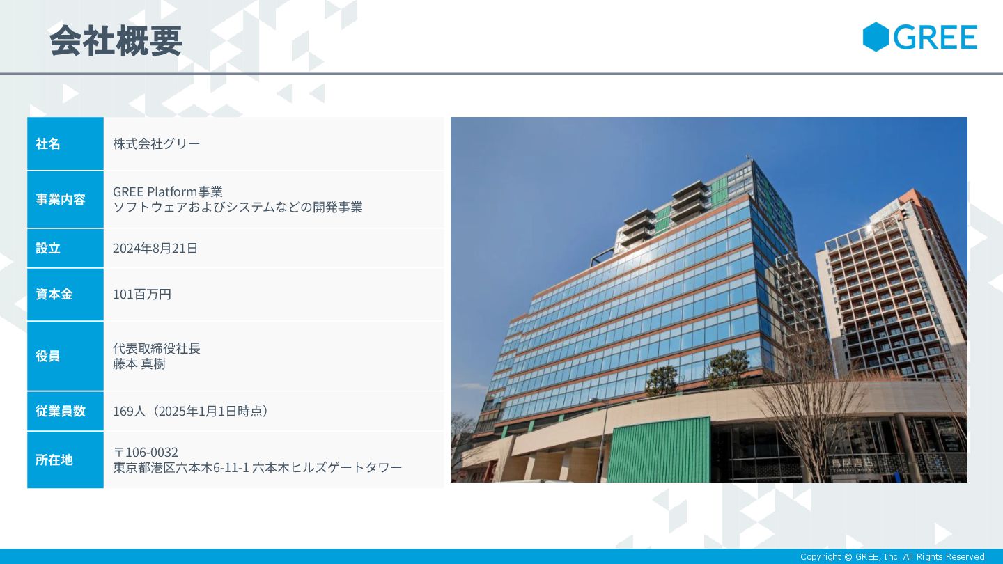 事業内容 GREE Platform事業 ソフトウェアおよびシステムなどの開発事業 設⽴ 2024年8⽉21⽇ 資本⾦ 101百万円 役員 代表取締役社⻑ 藤本 真樹 従業員数 169⼈(2025年1⽉1⽇時点) 所在地 〒106-0032 東京都港区六本⽊6-11-1 六本⽊ヒルズゲートタワー