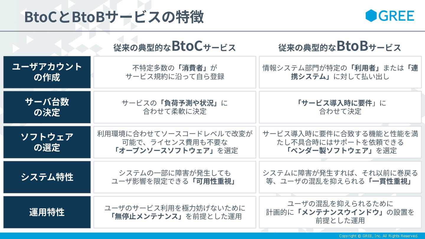 サーバ台数 の決定 ソフトウェア の選定 システム特性 運⽤特性 不特定多数の「消費者」が サービス規約に沿って⾃ら登録 サービスの「負荷予測や状況」に 合わせて柔軟に決定 利⽤環境に合わせてソースコードレベルで改変が 可能で、ライセンス費⽤も不要な 「オープンソースソフトウェア」を選定 システムの⼀部に障害が発⽣しても ユーザ影響を限定できる「可⽤性重視」 ユーザのサービス利⽤を極⼒妨げないために 「無停⽌メンテナンス」を前提とした運⽤ 情報システム部⾨が特定の「利⽤者」または「連 携システム」に対して払い出し 「サービス導⼊時に要件」に 合わせて決定 サービス導⼊時に要件に合致する機能と性能を満 たし不具合時にはサポートを依頼できる 「ベンダー製ソフトウェア」を選定 システムに障害が発⽣すれば、それ以前に巻戻る 等、ユーザの混乱を抑えられる「⼀貫性重視」 ユーザの混乱を抑えられるために 計画的に「メンテナンスウインドウ」の設置を 前提とした運⽤ 従来の典型的なBtoCサービス 従来の典型的なBtoBサービス